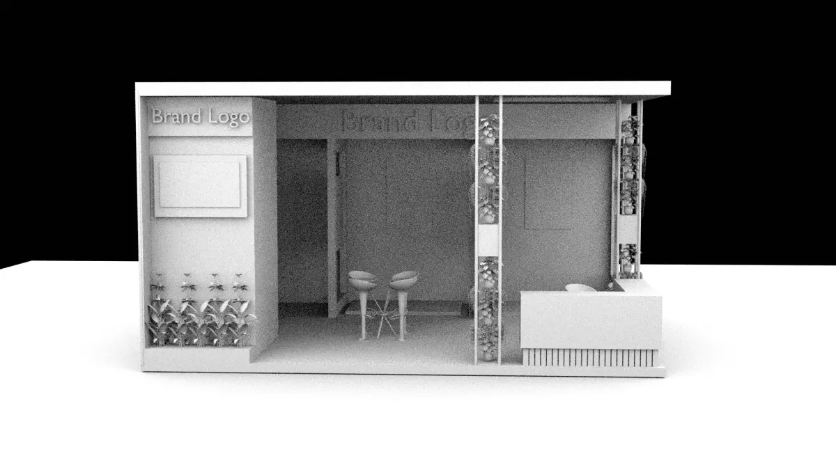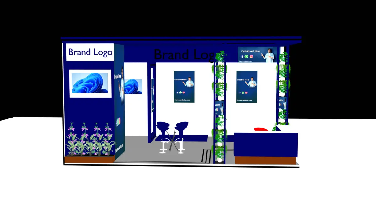3D Exhibition Stall Design DescriptionThis 3D exhibition stall model, created and rendered in Blender 4.3, rendered in Cycles, showcases a clean, modern aesthetic with a blue-and-white theme that gives a vibrant and professional appearance. The layout is designed to attract attention in a trade show or expo environment.Key Features:Brand Visibility:Prominent placement of the Brand Logo on multiple fascia panels ensures maximum visibility from various angles.Front Display Panel:A large vertical panel at the corner features a friendly model pointing to a space for custom creatives. Ideal for promoting services, offers, or featured digital content.Digital Screens:Multiple wall-mounted digital displays are used to highlight product features, brand videos, or interactive presentations.Furniture Setup: Includes high stools and counter seating, creating an inviting and professional space for engaging with visitors.Greenery Integration:Vertical green plant panels and potted plants are incorporated for a natural, welcoming touch that enhances the overall aesthetic.Reception Desk:A uniquely angled reception counter at the front corner provides a central point for greeting guests and offering information.Technical Details:Rendered Engine: Cycles 4.3Lighting: Studio HDRI environment lighting with additional softbox-style area lights for balanced shadows and highlights.Materials Used: Principled BSDF shaders for realistic surfaces including plastic,vinyl banners, plant textures, and wood trims.Post-processing: Minor contrast and clarity adjustments done via Blender’s compositor for a vivid, polished render output.