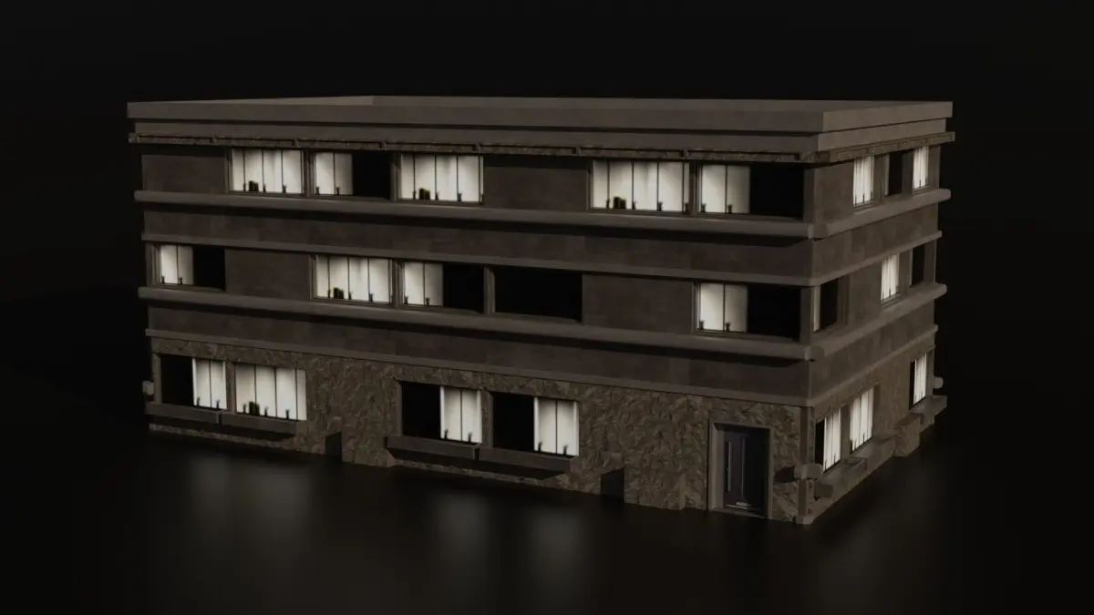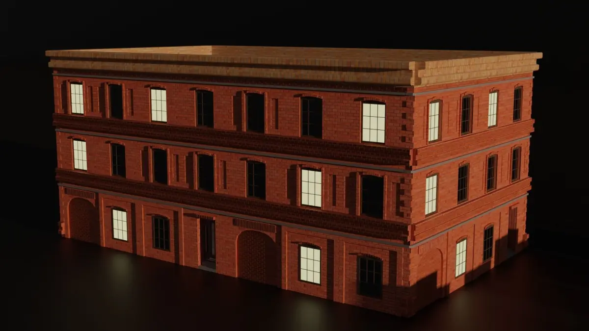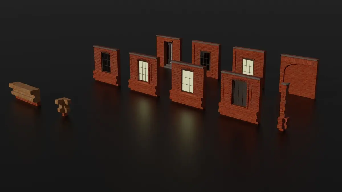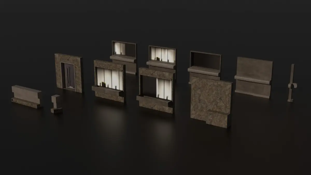 Two architectural designs for procedural buildings. The first design is in concrete and the second in brick. These two designs contain: