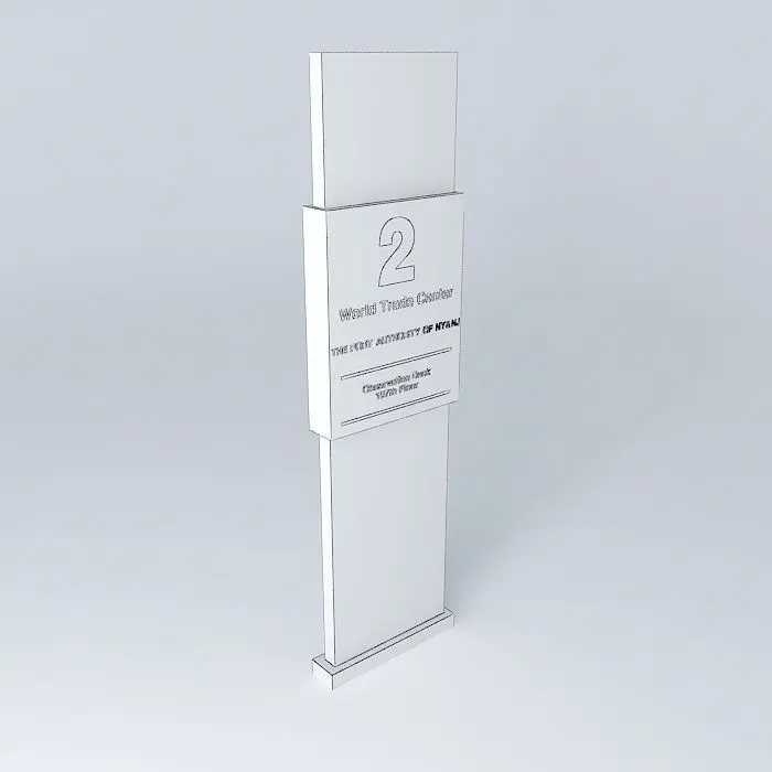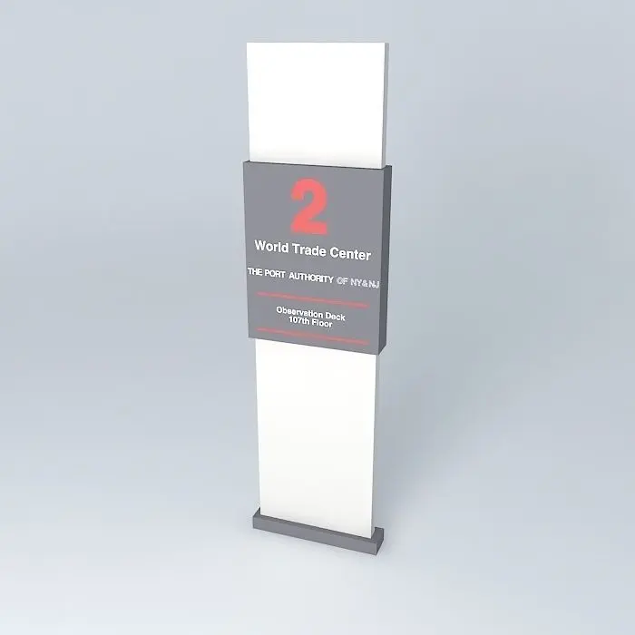 This 3D model was originally created with Sketchup 8 and then converted to all other 3D formats. Native format is .skp 3dsmax scene is 3ds Max 2016 version, rendered with Vray 3.00 This was the original design of the Austin Tobin Plaza lobby signs that stood at various points around 2 World Trade Center. The model is NOT photo-textured. Many thanks to WTComplete for both the original sign, and all of the great models under the WTComplete name.