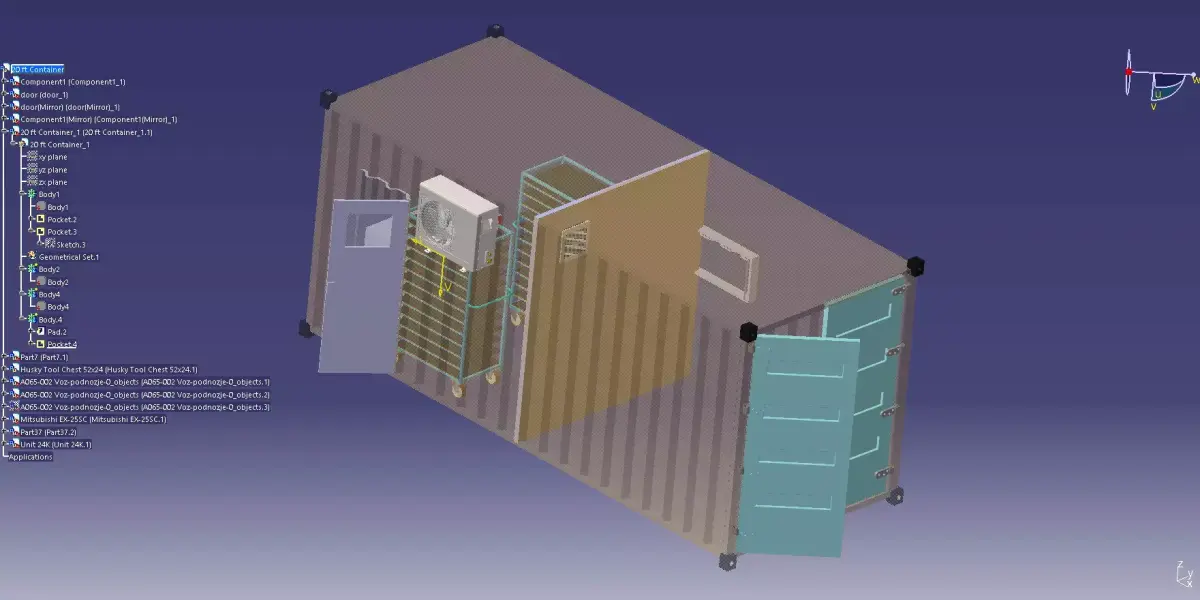 The 20-ft container 3D model was successfully divided into two sections: one designated for tool storage and the other for staff use. The task was completed satisfactorily. The 3D model included an air conditioner, racks, an exhaust fan, a toolbox, and a back door
