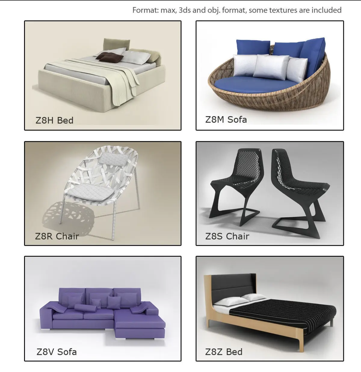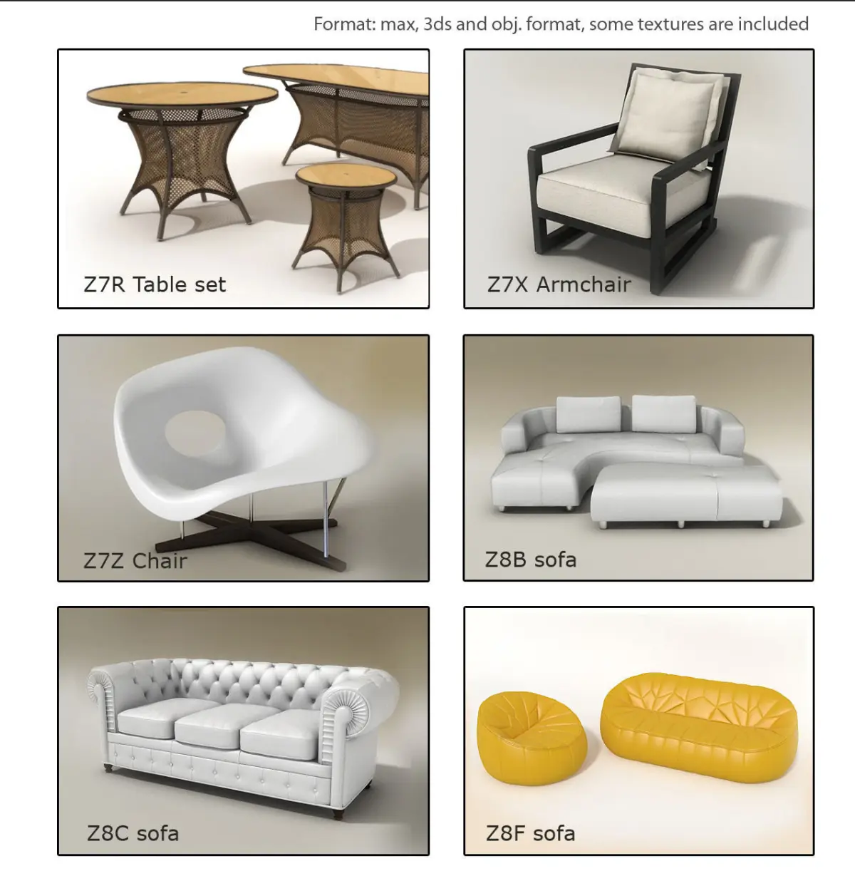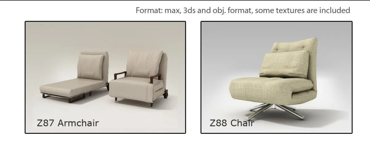 20 furniture 3d Models. Tables, chairs, couches and more. They can be used in most 3d software such as 3ds max, maya, sketchup, blender, and similar. Please take in mind, that renders shown are made applying special shaders, materials, light setup and render engine. These render elements are not provided in the 3d model.Some models doesn’t contain textures (see properties for each one).Models provided with textures are UVW mapped before collapse mesh, textures must be only redirected.