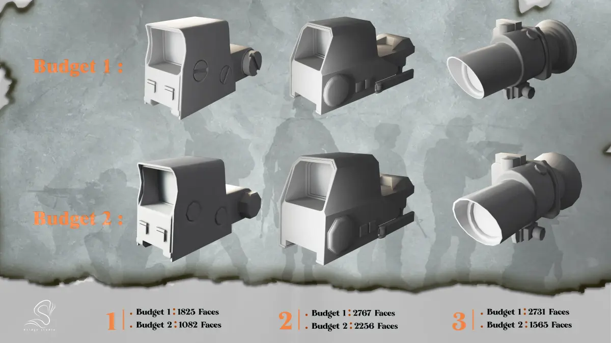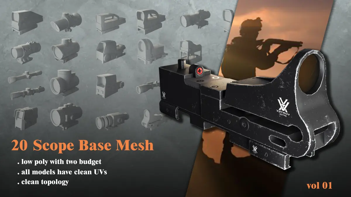 Hello GuysThis Time We Create 20 Low Poly Scope Base Mesh In This Package You Will Receive 20 Guns Scope Base Mesh In 2 Budget(Low Poly).All Of The 40 Scopes Are Unwrapped And Have Clean Mesh.So You Can Bake Them Or Make High Poly Of Them Easily.