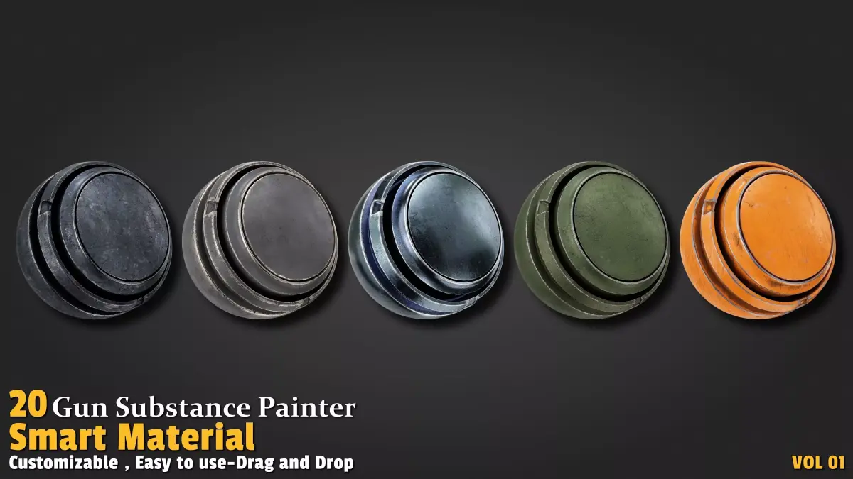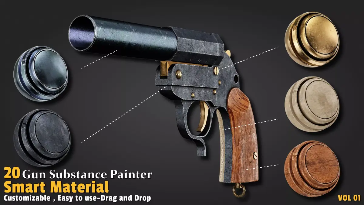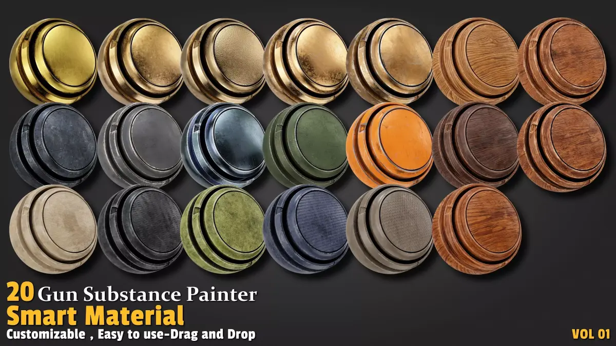 This pack includes 20 professional Gun Smart Materials created in Substance Painter version 11. It features 5 Wood materials, 5 Metal materials, 5 Gold Metal materials, and 5 Plastic materials. All are in SPSM format with high-quality previews and fully Drag & Drop ready.