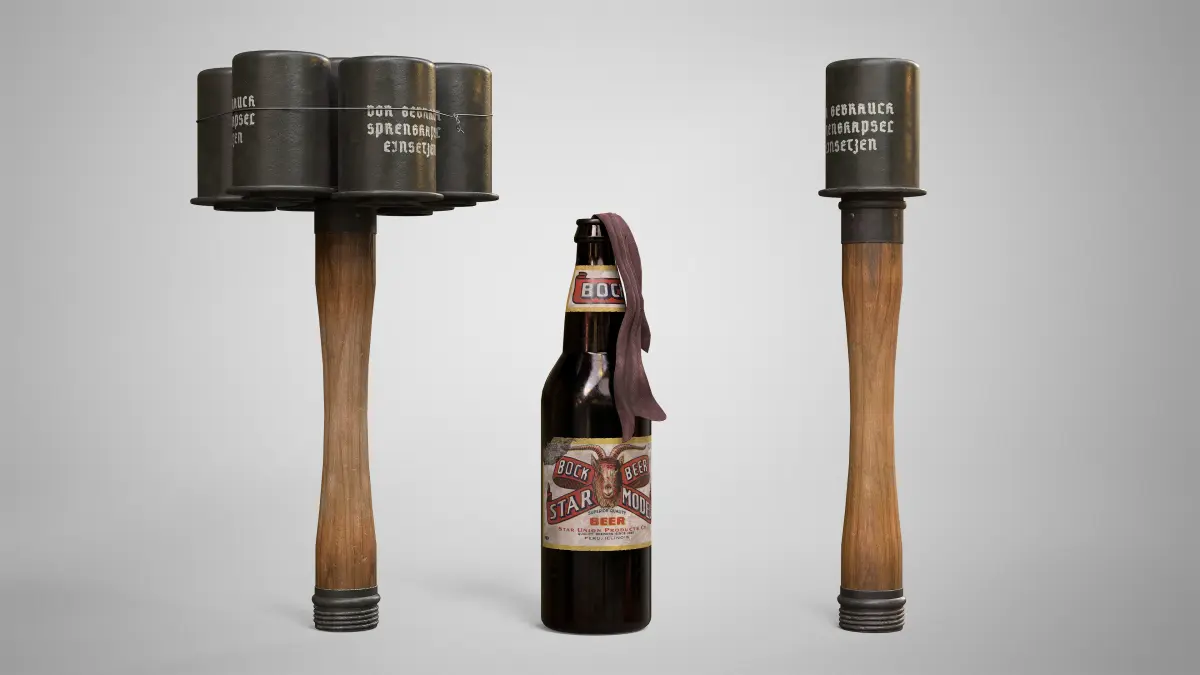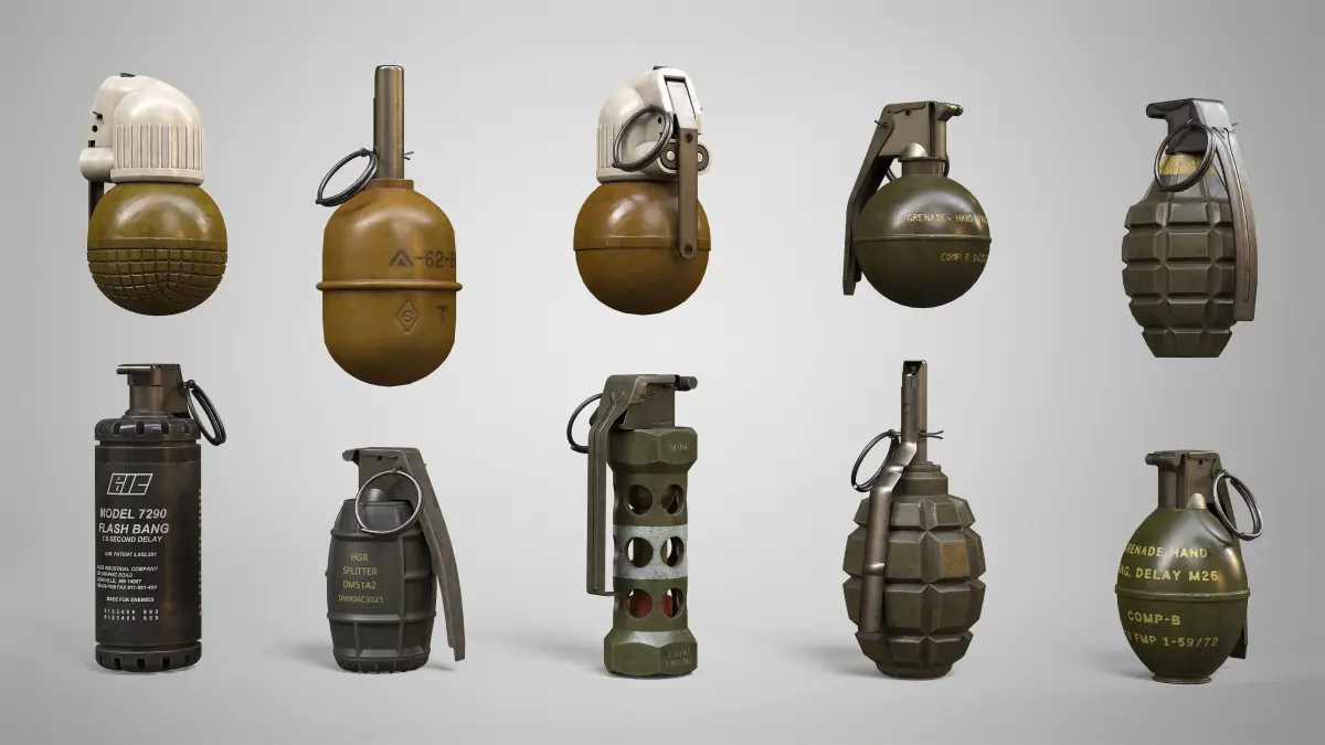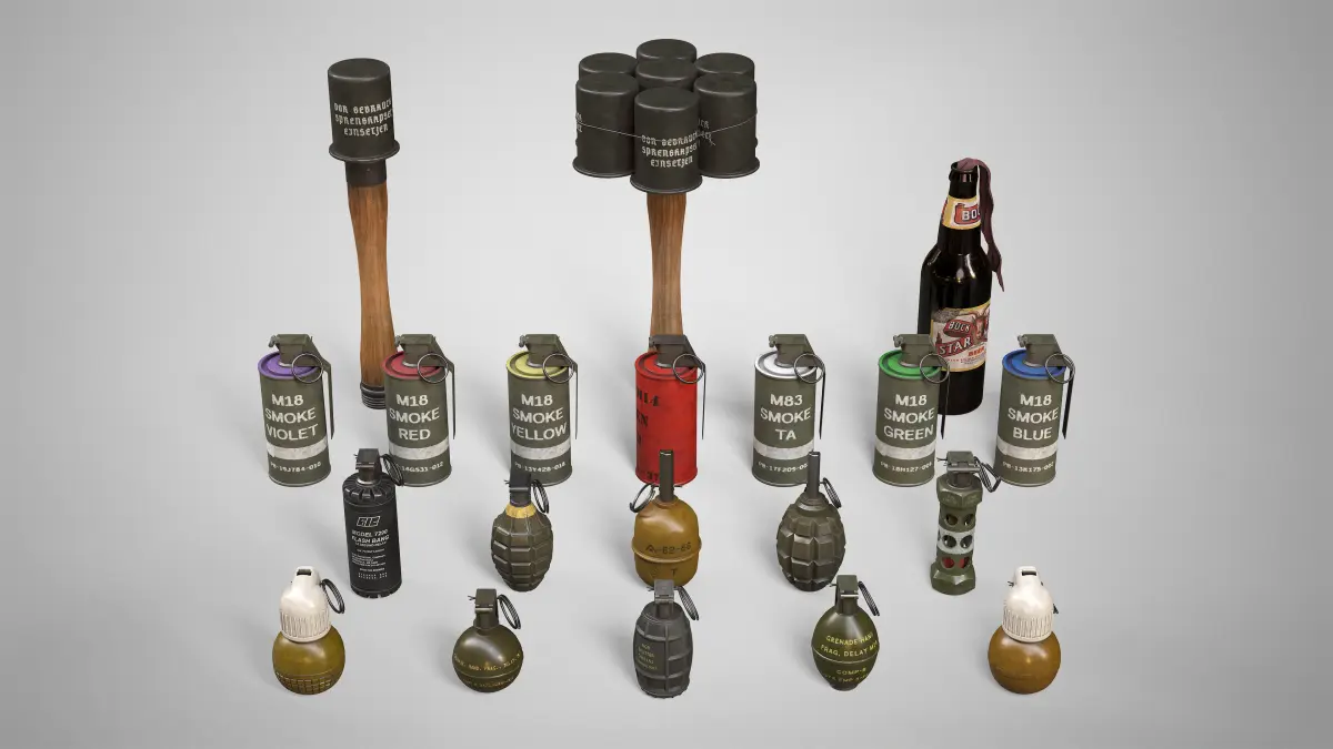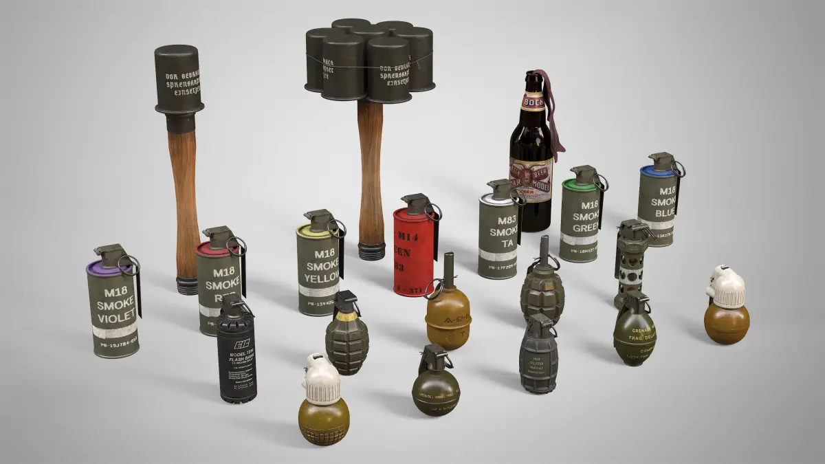 With this collection you obtain highly detailed, PBR, low-poly, game ready models of a DM51, F1, AN-M14, M24, M24 BUNDLE, M26, M67, M7290, MK2, MOLOTOV COCKTAIL, RGD5, RGN, RGO, M18 SMOKE IN 5 COLORS and M83 hand grenades.This realistic collection of 3D grenade models is perfect for mmo, fps, shooter, action, rpg, strategy, horror, battle royale, adventure and other game genres. It can also be used in movies, TV shows, video clips, cartoons to extend your filming set. All models were created in Autodesk Maya 2022, textured in Substance Painter and rendered in Marmoset Toolbag 4.
