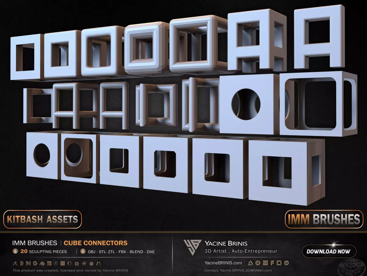 I am presenting a focused collection of 20 hard surface IMM cube connector elements, structured for modular construction, structural assemblies, and advanced hard surface workflows.