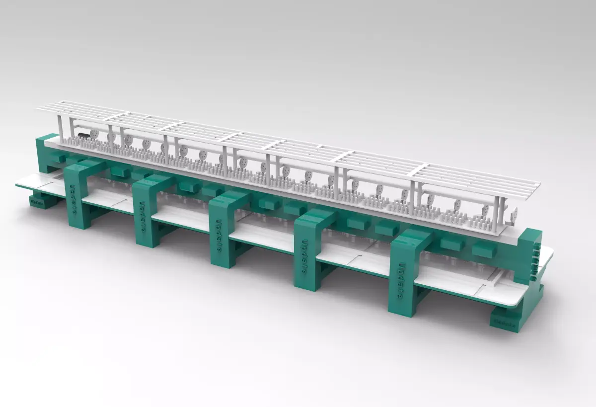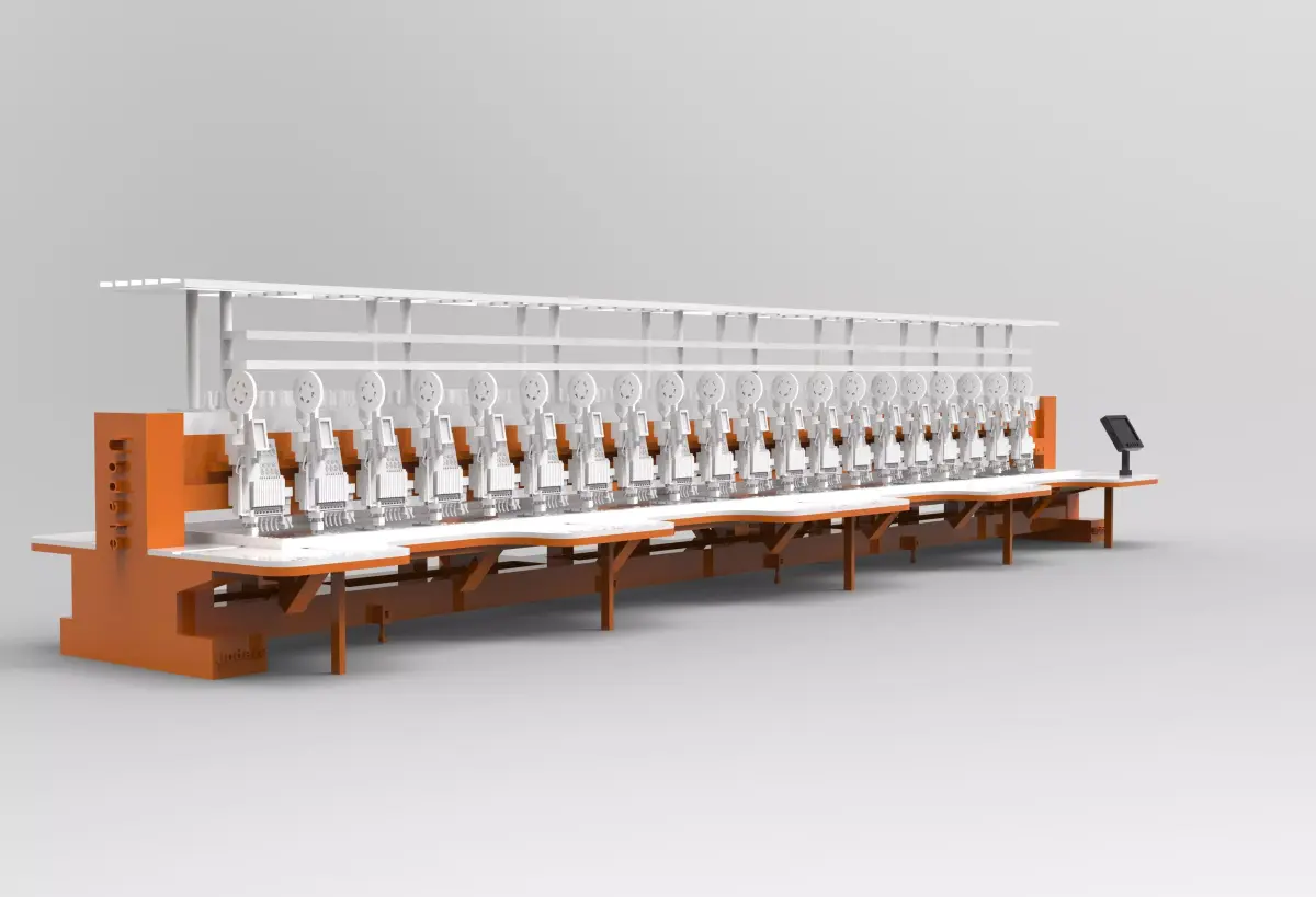 - 20 synchronized embroidery heads arranged at equal spacing, enabling efficient mass production.
