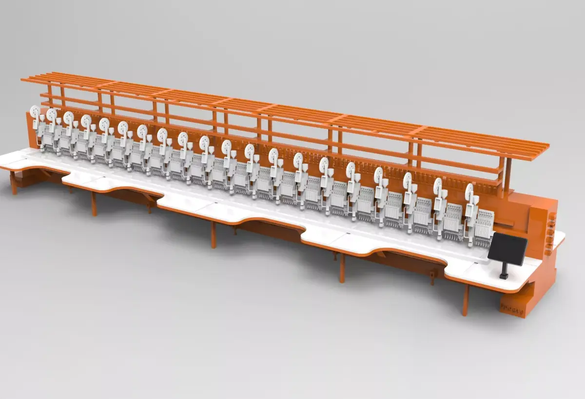 This 3D CAD model represents a 20-head high-speed computerized embroidery machine built for industrial textile and garment decoration. The design captures the essential components of a production-ready unit, emphasizing both accuracy and manufacturability.