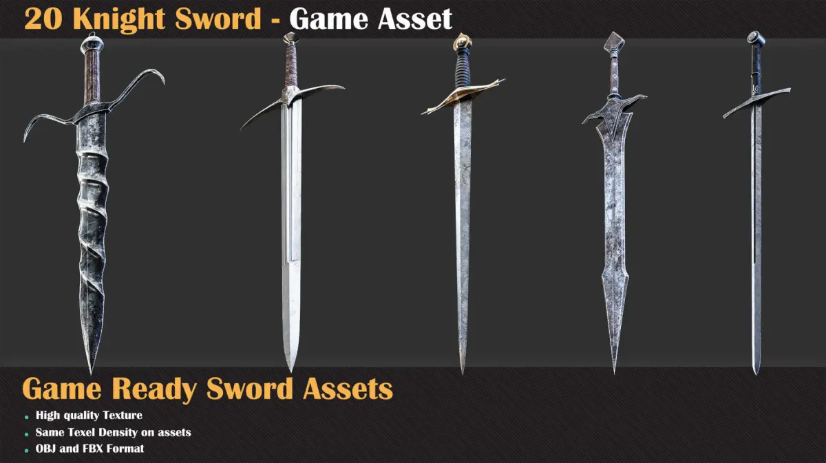 Elevate your projects with our stunning collection of 20 sword models, designed for maximum realism and detail. Each sword is meticulously crafted with polygon counts ranging from 6,000 to 24,000 triangles, ensuring both beauty and performance.