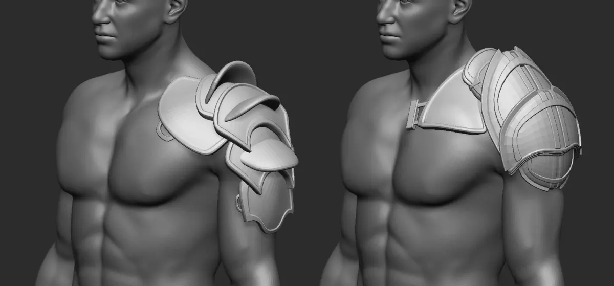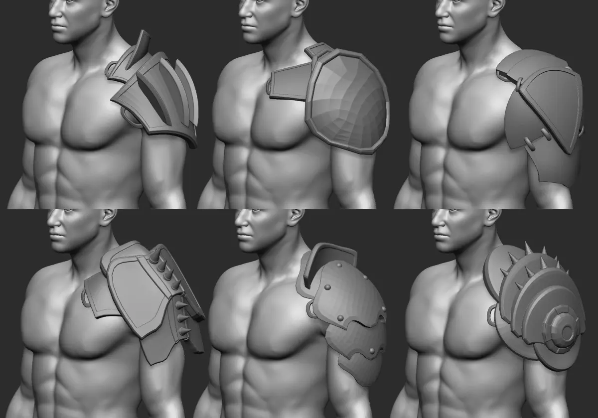 20 Medieval fantasy low-poly shoulder armor base mesh IMM brush set for Zbrush, fbx and obj files.