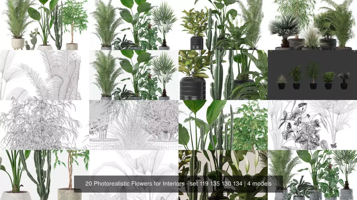 20 Photorealistic Flowers for Interiors - set 119 135 130 134 Plants collection 119Details:Polygons: 796334 Vertexes: 1118576Plants collection 135 Details:Polygons: 1099501 Vertexes: 1249302Plants collection 130Details:Polygons: 407687 Vertexes: 433583Plants collection 134Details:Polygons: 366643 Vertexes: 414393
