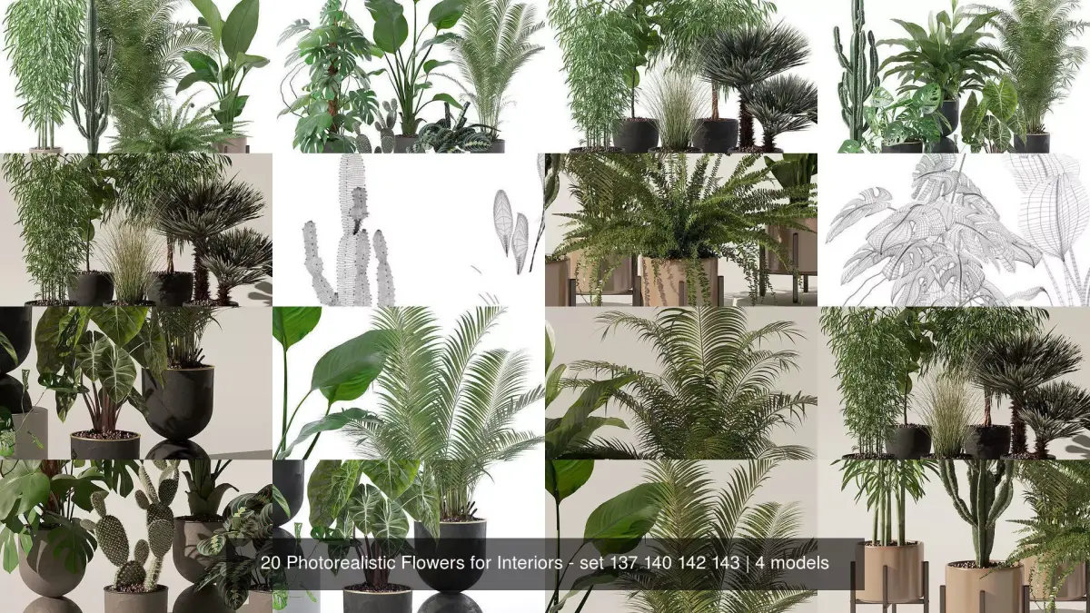 20 Photorealistic Flowers for Interiors - set 137 140 142 143Plants collection 137Details:Polygons: 543075 Vertexes: 728229Plants collection 140Details:Polygons: 928670 Vertexes: 982071Plants collection 142Details:Polygons: 711525 Vertexes: 770193Plants collection 143Details:Polygons: 575263 Vertexes: 868833