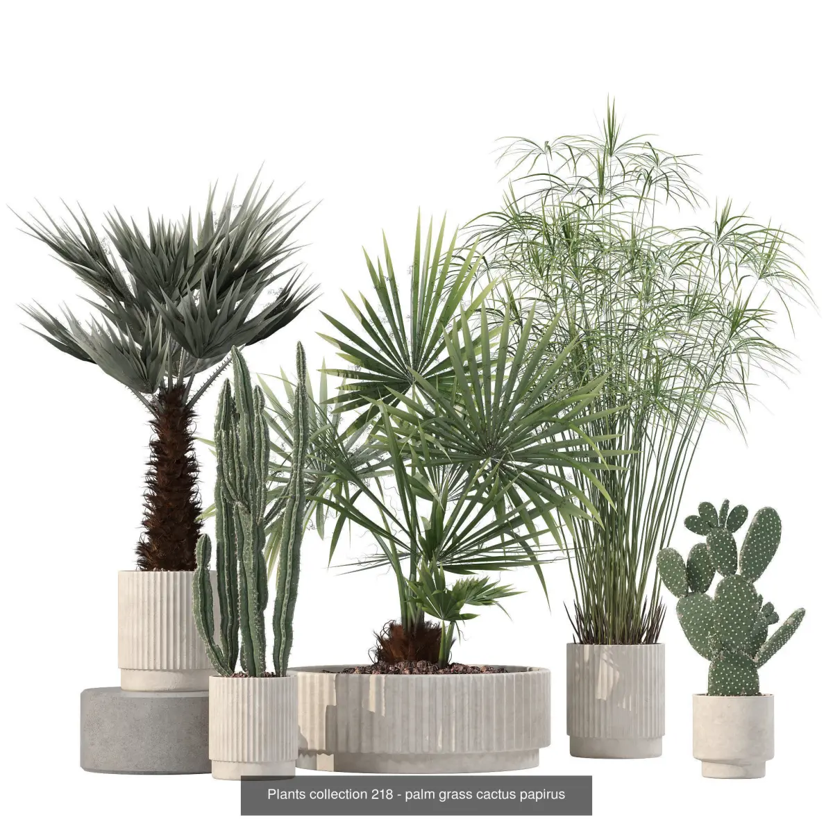 Plants in rattan flower pot collection 218 - palm chamaerops, palm washingtonia, papirus, opuntia cactus, euphorbia candelabrum
