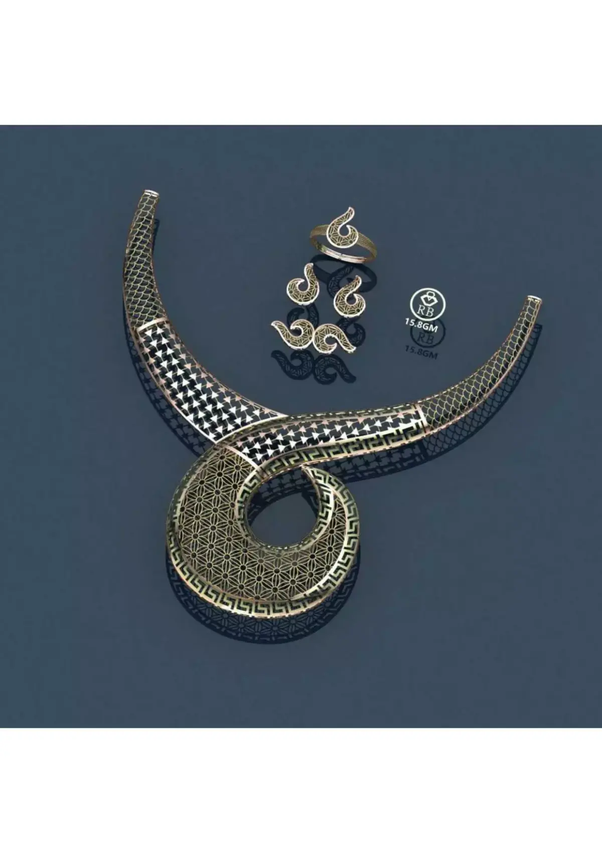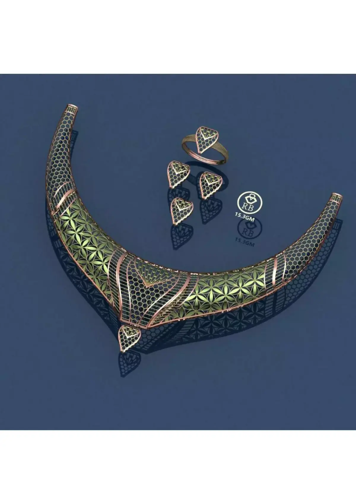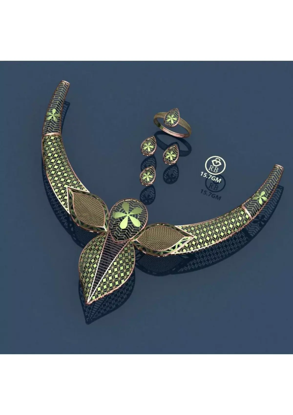 A massive collection of 20 unique matching Necklace, Ring, and Earring Sets designed for high-profit, low-metal-weight casting. These intricate designs feature expansive filigree, geometric patterns, and openwork suitable for enamel or color treatment (Meenakari). CRITICAL: Metal thickness is only 0.2 mm, resulting in an ultra-lightweight set (13 GM to 17 GM total). Files are 3DM Master Files ONLY (NO STL), requiring professional skill for printing and casting.