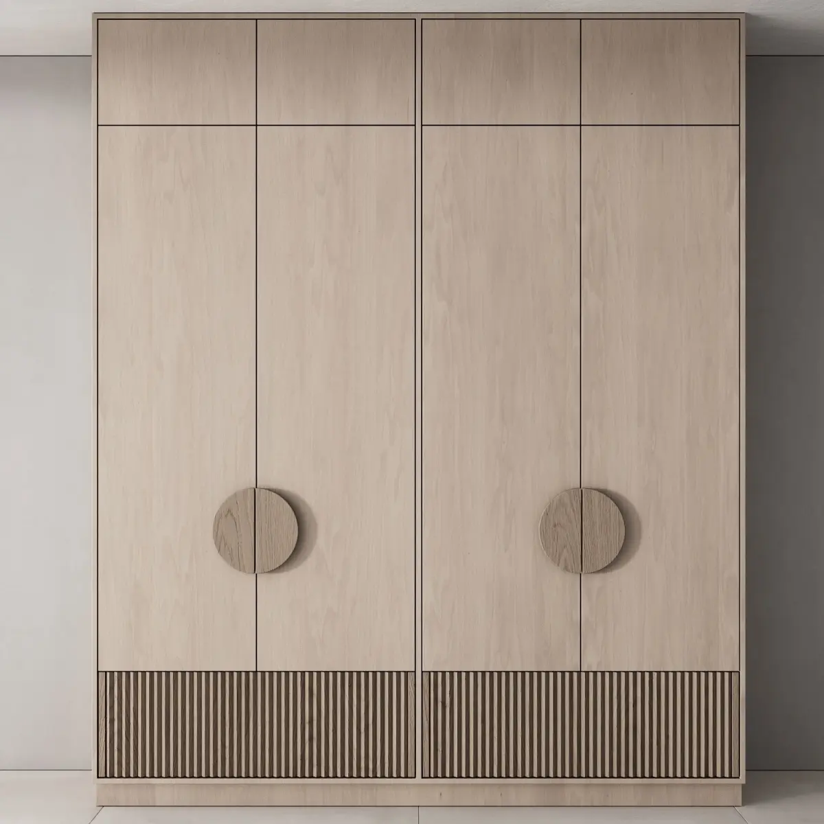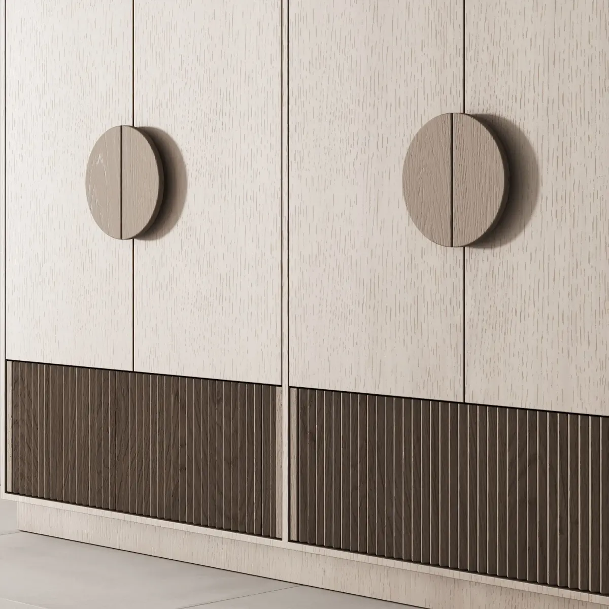3d model of a floor cabinet / wardrobe for a nursery in 3 different material options for use in an interior in the style of modern / minimalism / Scandinavian / japandi / wabi sabi.