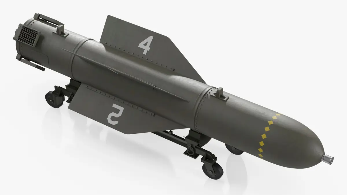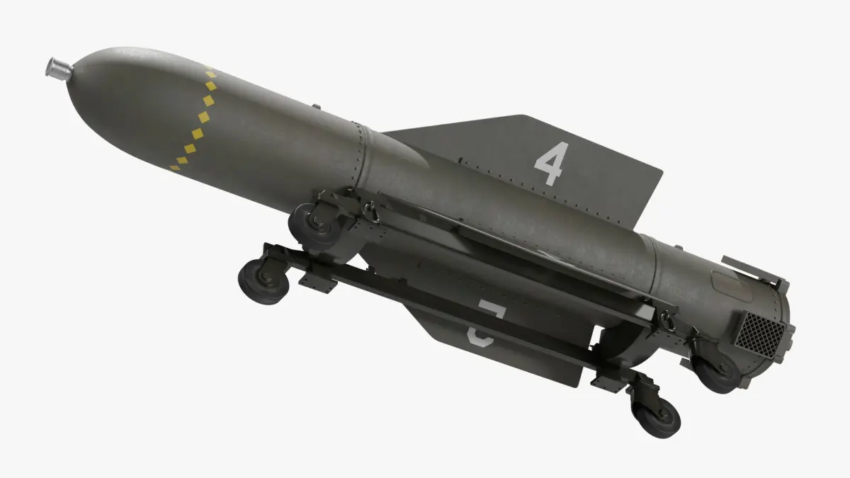 2000 Pound Tactical Bomb On Support Cart is a 3d model of a modern tactical missile, designed for high precision and efficiency in military operations.