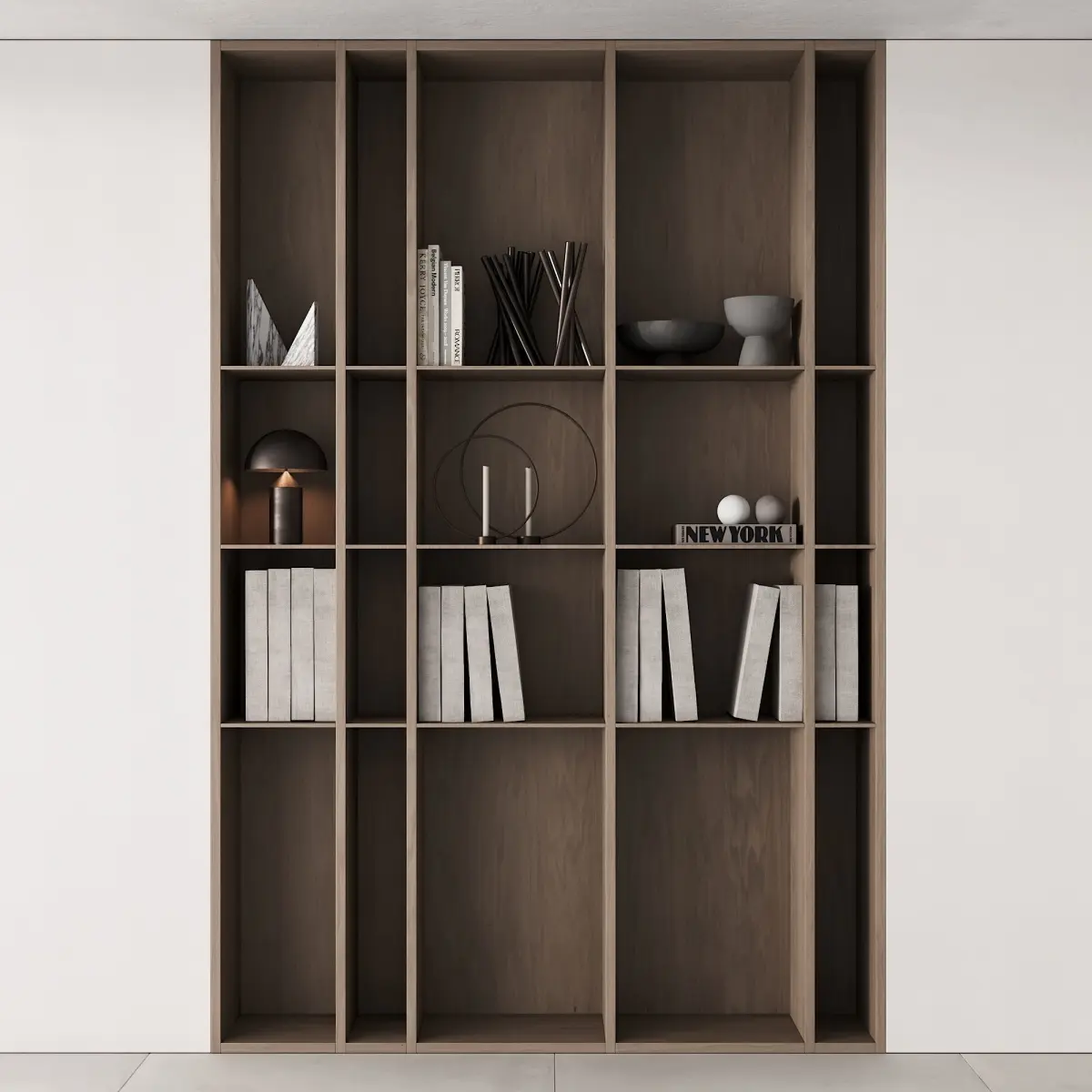 Built-in floor/wall shelving/book shelf filled with decor. Suitable for modern/minimalist/scandinavian/japandi/wabi sabi interiors.