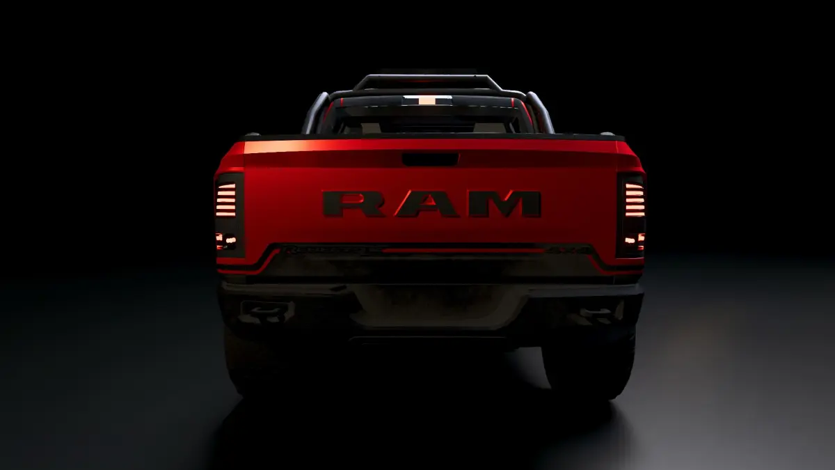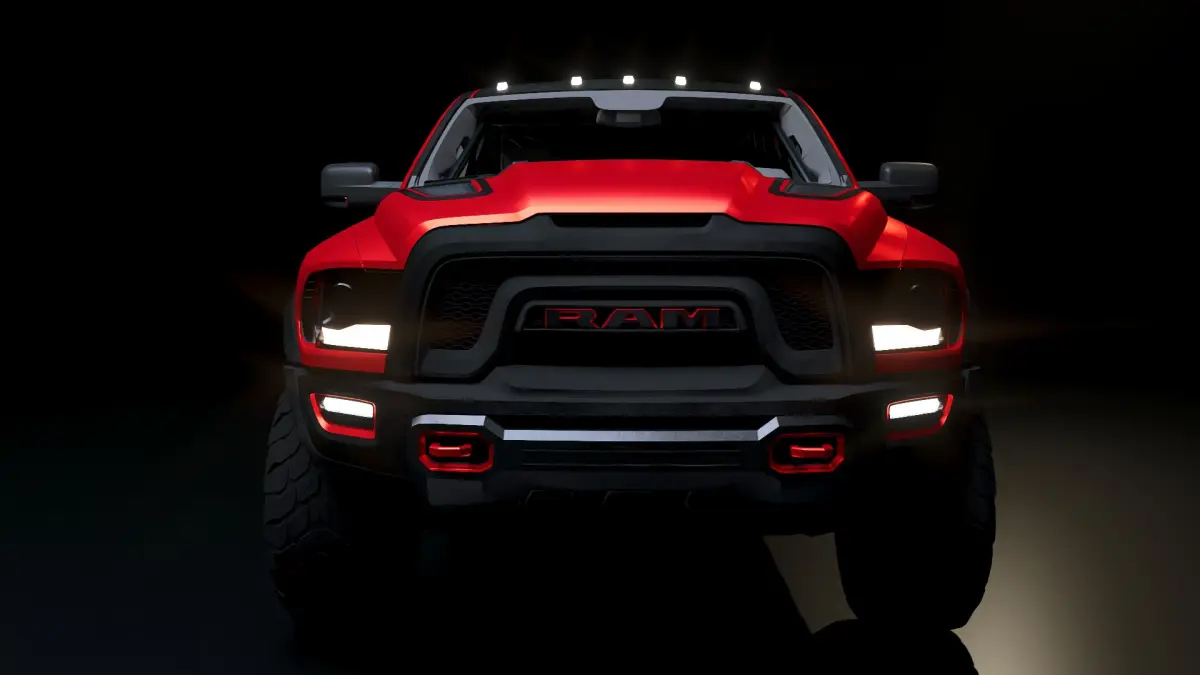 Aggressive front fascia with signature RAM grille and LED headlights.Wide fenders with flared arches and mud flaps.Functional hood scoop and air vents.Blacked-out side mirrors and trim.35-inch off-road tires on custom wheels.Optional bed-mounted spare tire and LED brake lights.Medium detailed interiors.