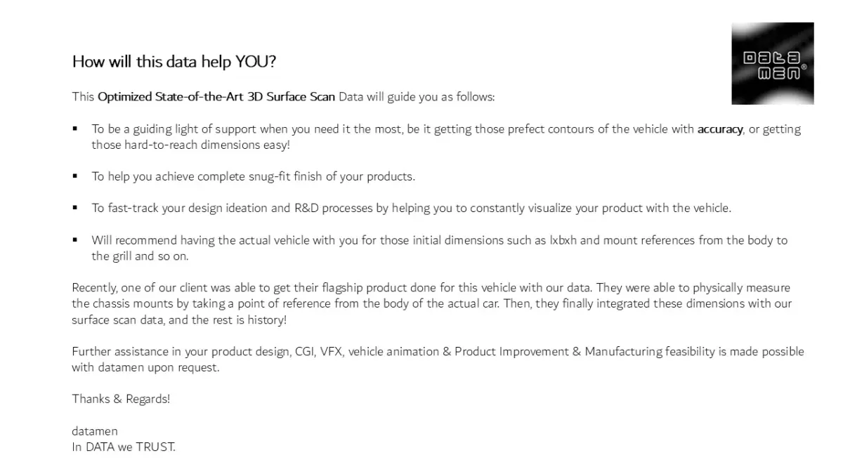 An SW Model comprising of the full front fascia, roof, cabin & fenders scan data.