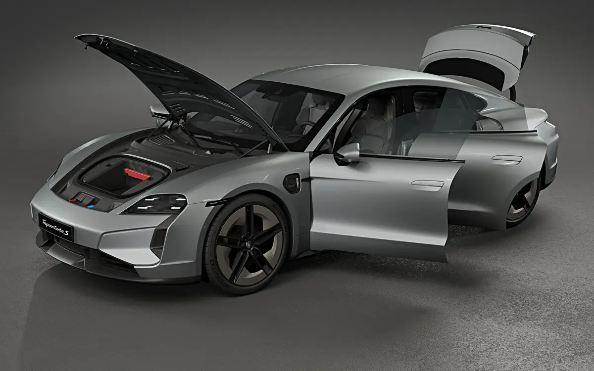 Photorealistic, high-quality and accurate 3D model of 2025 Porsche Taycan Turbo S with high detailed interior openable hood and trunk.