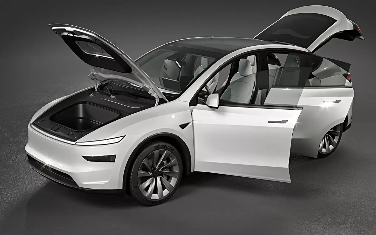 Photorealistic, high-quality and accurate 3D model of 2025 Tesla Model Y Pearl White with high detailed interior, medium detailed undercarriage and openable frunk and trunk.