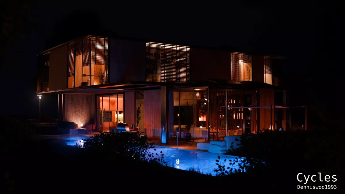 This is a high quality modern brutalist villa with a fully furnished interior for Blender Eevee and Cycles