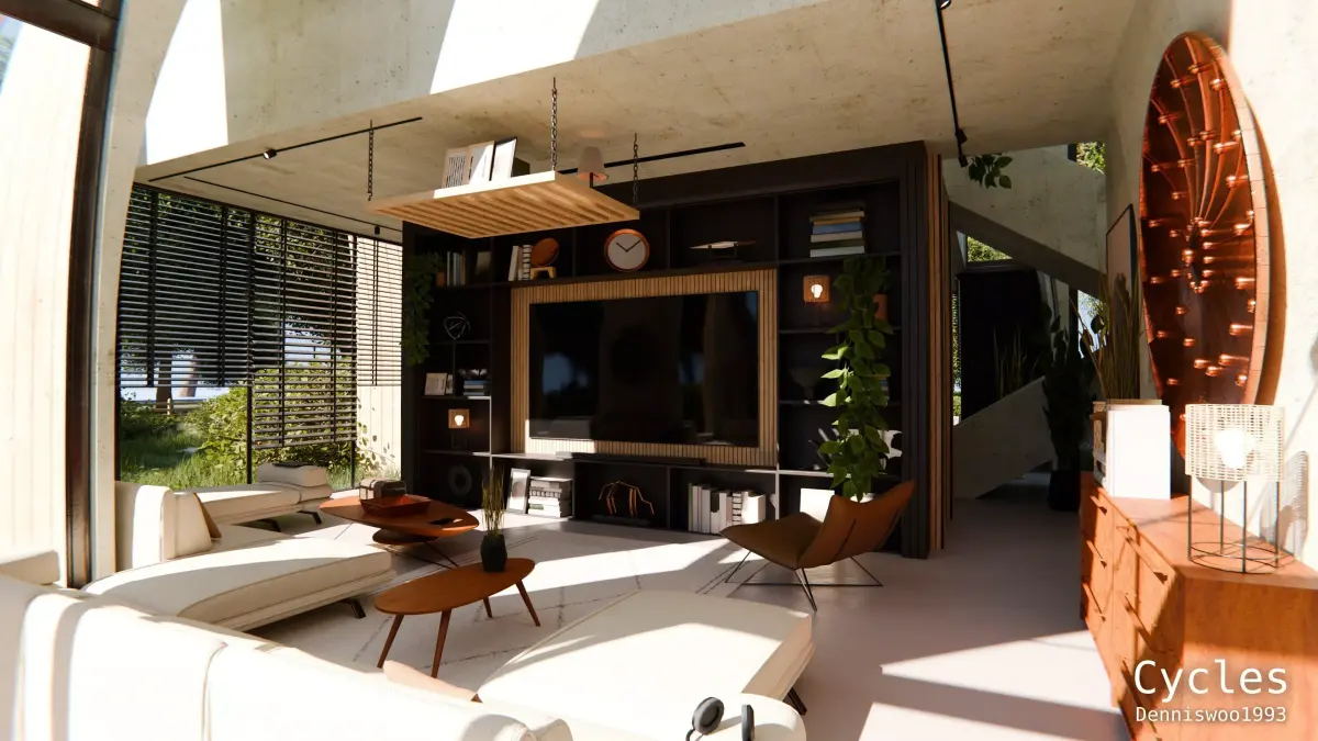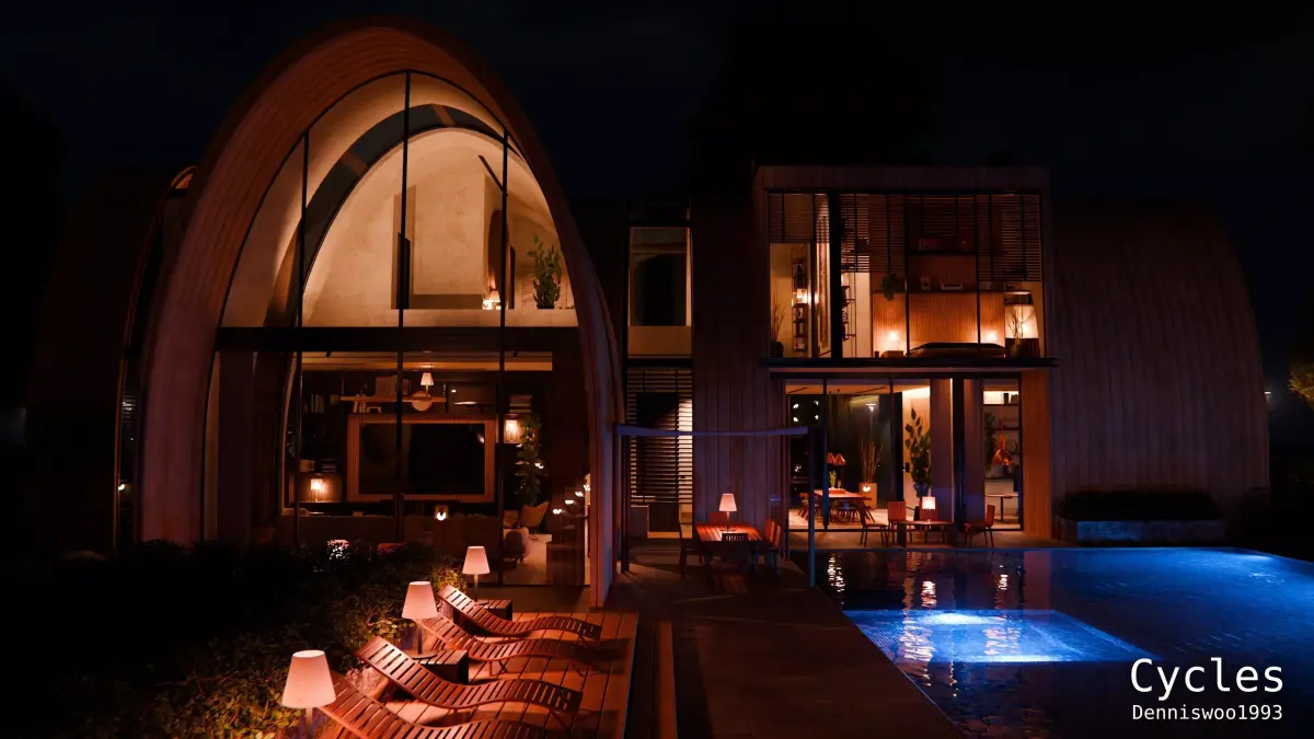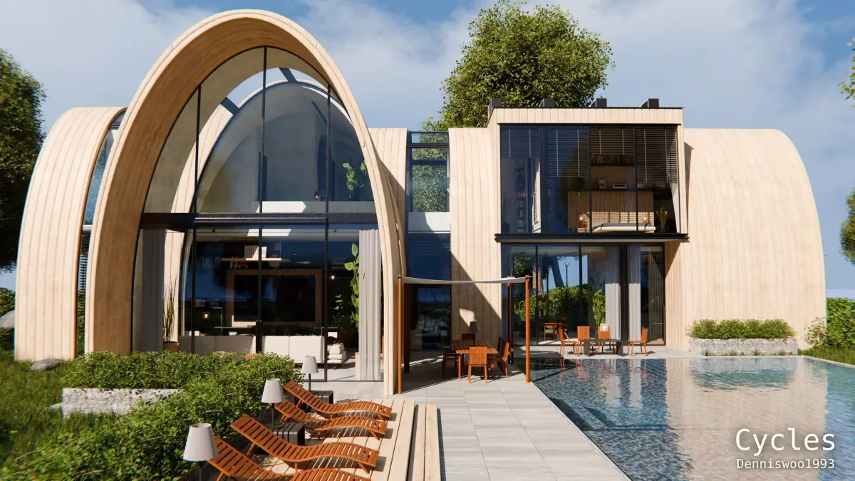 This is a high quality modular modern curved roof villa with a fully furnished interior for Blender Eevee and Cycles