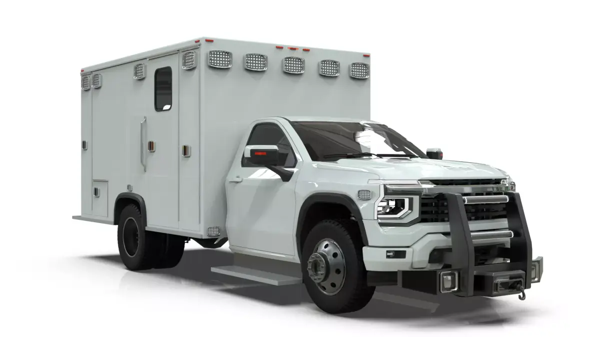 This is a high-fidelity conceptual 3D model of a 2027 Silverado, professionally adapted into a Modern Ambulance and EMS Rescue Unit. Built on a heavy-duty single-cab dually chassis, this asset represents the next generation of emergency medical services, combining a sleek near-future aesthetic with a functional modular rescue body.