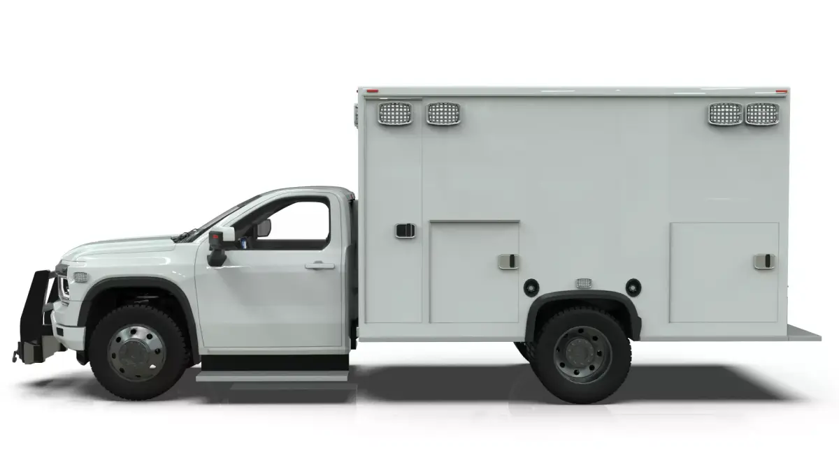 Key Features:Specialized Configuration: Modular EMS rescue body with detailed side access panels and industrial hardware.