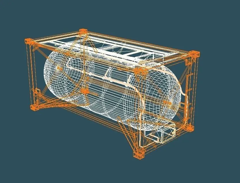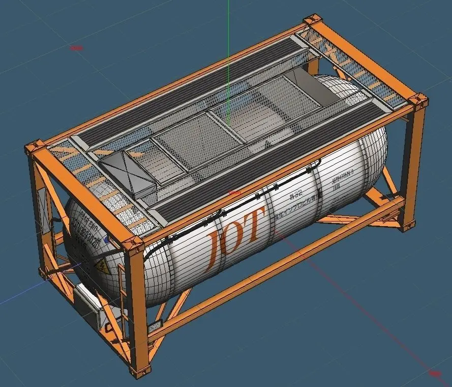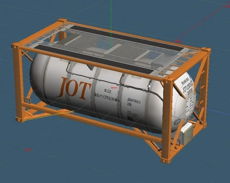 20フィートサイズの液体用運輸コンテナーです。鉄道、トレーラー、コンテナ船で運ばれ、ヤードや港のバースで一時保管後に通関が通りしだい各工場へ輸送されます。本品は1パーツモデルです、背景やトレーラーの荷台に置いて演出して下さい、通常のコンテナー群の中に置くとアクセントに成って良いかも知れません。It is not a stl file for 3D printing.