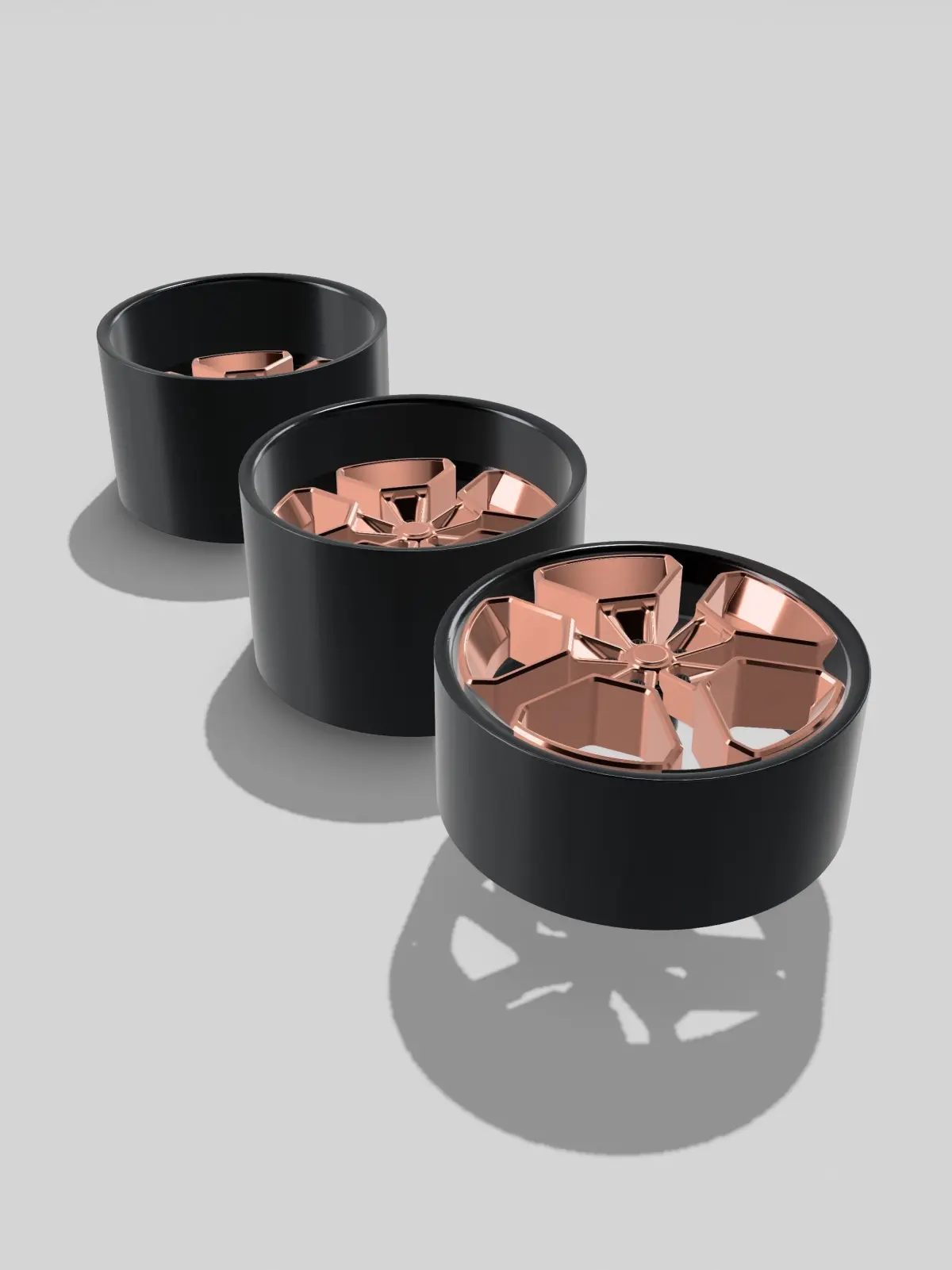 Designed from scratch is a set of Huracan style 5 loop wheels in 3 offsets (light concave, medium concave, and deep concave), with a 5 stud format. Comes with a stretched directional tire, high in detail, ideal for scale modeling (currently in 1/24 and 1/25 scale).