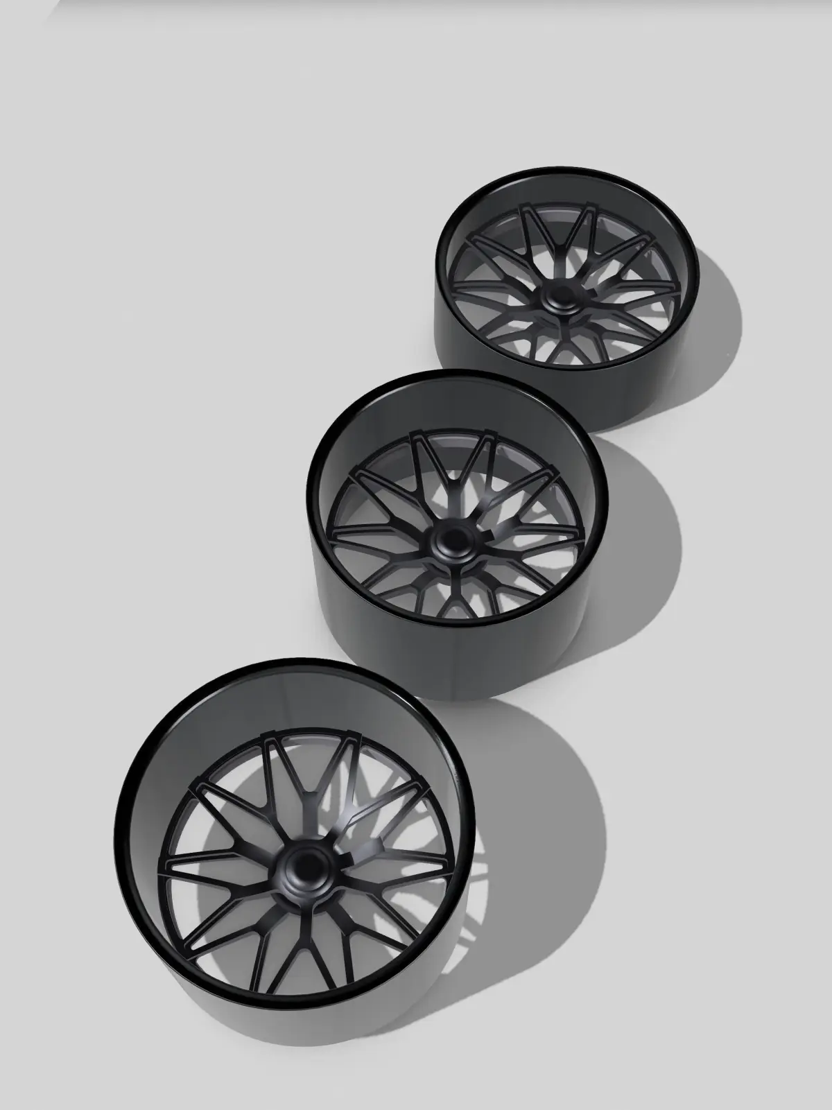 Designed from scratch is a set of Schott Wheels Clever Levers style 5 loop wheels in 3 offsets (light concave, medium concave, and deep concave). Comes with a stretched directional tire, high in detail, ideal for scale modeling (currently in 1/24 and 1/25 scale).