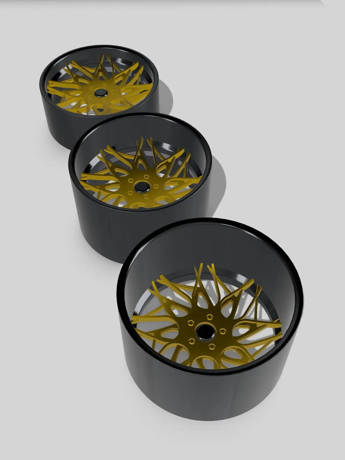 Designed from scratch is a set of Trinity style 5 wheels in 3 offsets (light concave, medium concave, and deep concave), with a 5 stud format. Comes with a stretched directional tire, high in detail, ideal for scale modeling (currently in 1/24 and 1/25 scale).