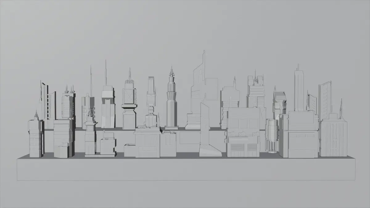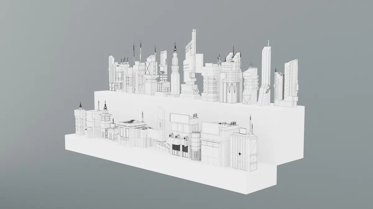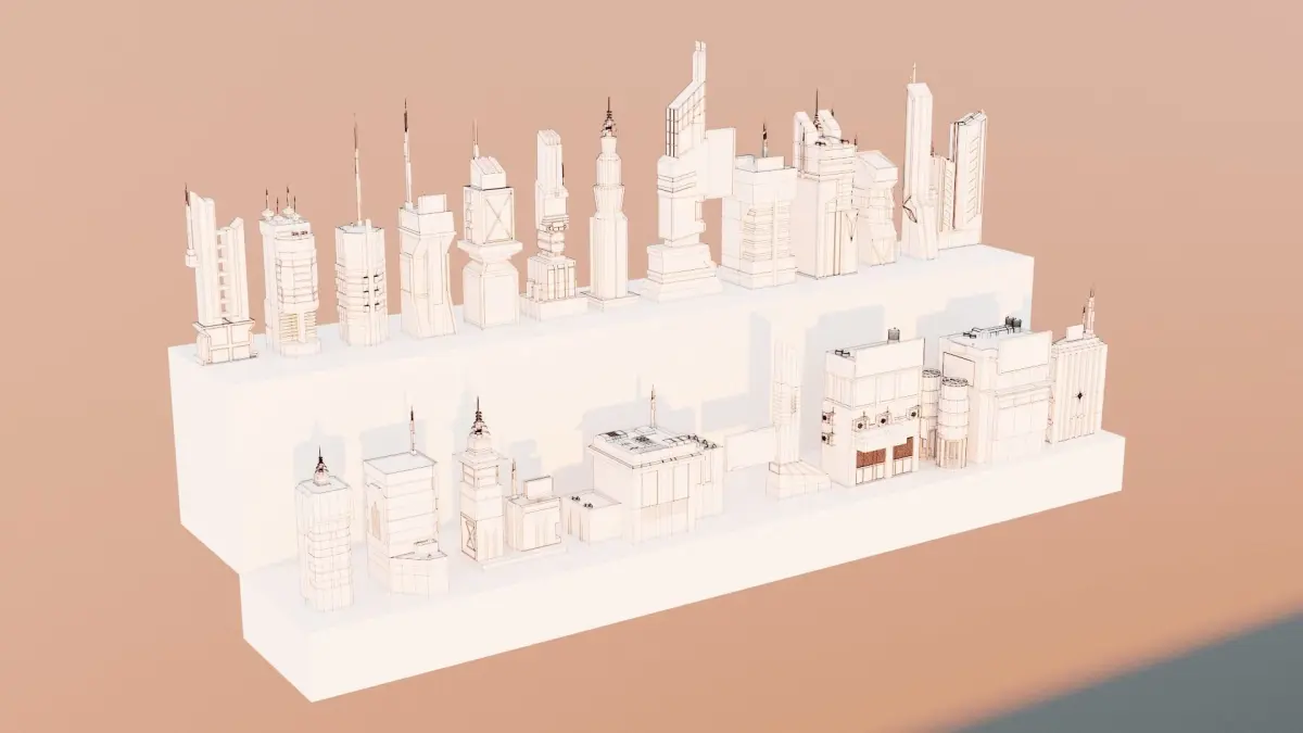 The polygon (verts) numbers of the buildings range from 750 to 8000 , the average number of triangle is 2000 per building. The total number of triangles is 61,043. Workbench and cycles Rendering used. You can see the outline of the structures from the photos