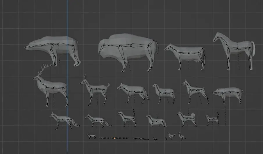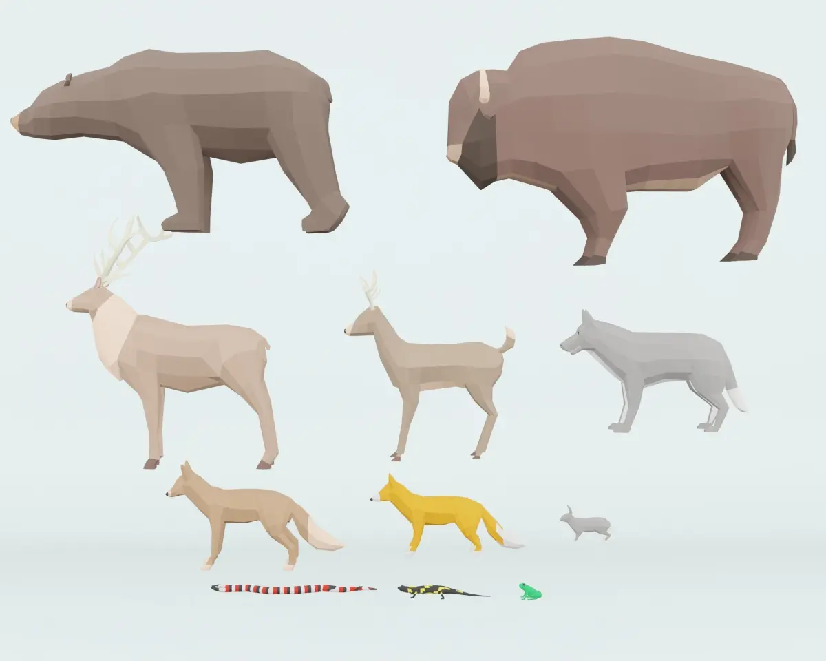 Here you can find 22 different domestic and wild animals , such as bear, fox, deer, doe, rabbit, snake, frog, salamandra, bison, cow, dog, cat, chicken, sheep, horse, pig and duck all have low polygonality, you can create an environment for your game or use these models as you want for example print or create art, because you can combine them and create landscapes, also on my page there are other low polygonal animal and plants, there are also many different models for your games or projects, go there are many interesting. Created in Blender 3.0. I will be grateful for comments and likes, for me it is important, thank you.