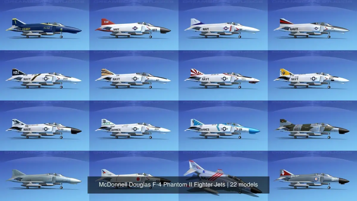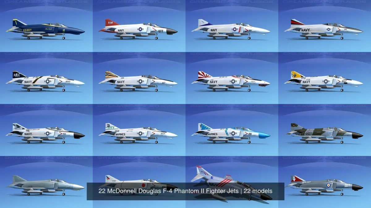 A collection of 22 McDonnell Douglas F-4 Phantom II jet 3D models. These jets were originally designed & first flown by US marines during WWII.Accurate 3d models created near to scale (within a few inches of actual general dimensions) according to the real reference. Phantom has a very detailed cockpit and exterior. It has animateable landing gear, landing gear doors and control surfaces. The canopy can be opened.Native format is 3ds Max version 13. Modell are exported to several different formats for a wide variety of end users. Other formats are exported in one resolution. This can be further subdivided. Exported formats are prepared well to work correctly with every standard modeling software. Compatibility level with other software’s may be limited.The model is built to be used in in-flight animations and video or simulation. It can also be used to populate an airport scene.Previews were rendered using 3dsmax standard scanline. Model unit is variable depending on the model and references. Textures and materials are included.