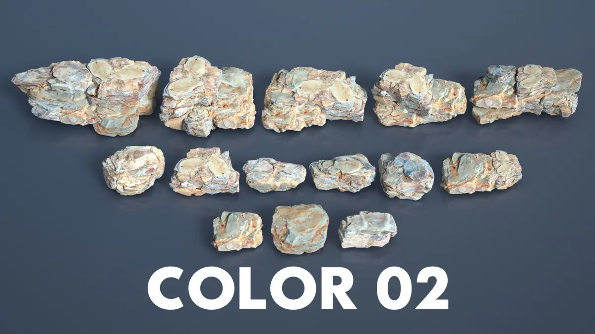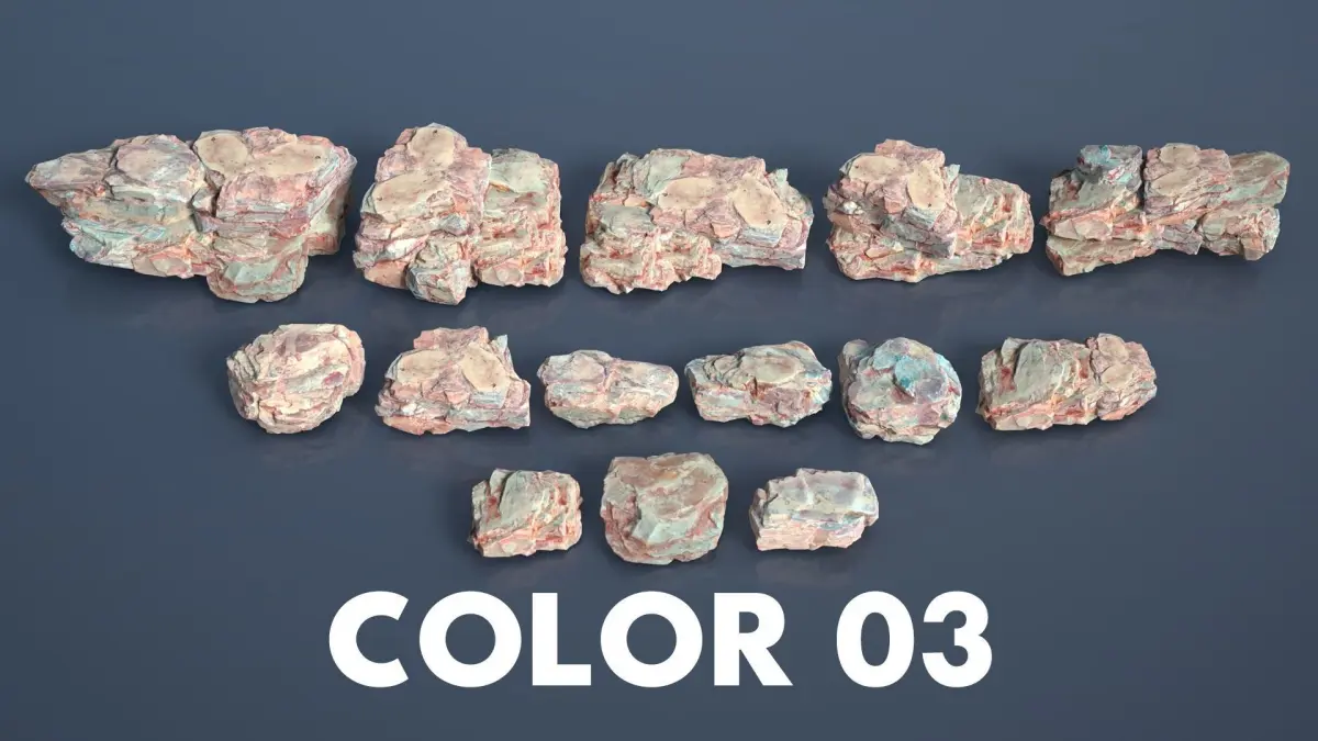 The product includes 22 Multiple Color Rock Modulars, the shape of this rock is relatively flat with many cracks, and the edges are quite sharp, giving a sense of hardness to the rock. The details of the model are depicted in all different angles, so you can replicate them, then rotate, flip, scale to combine them and create a variety of shapes.