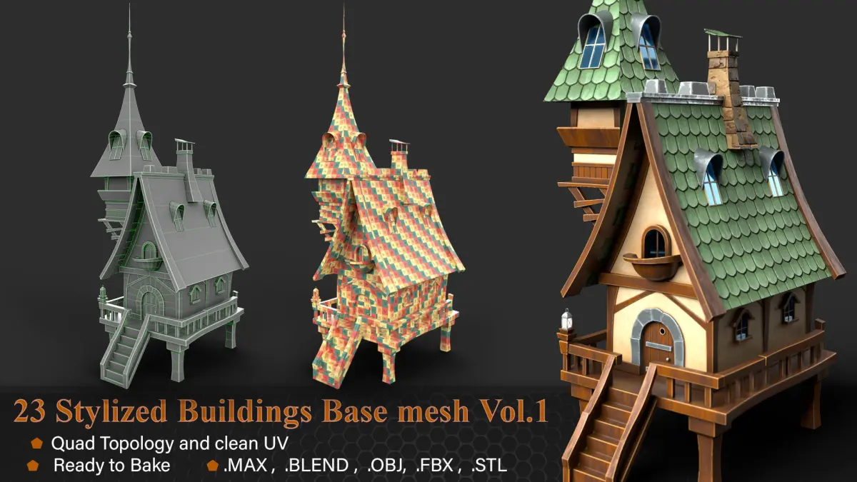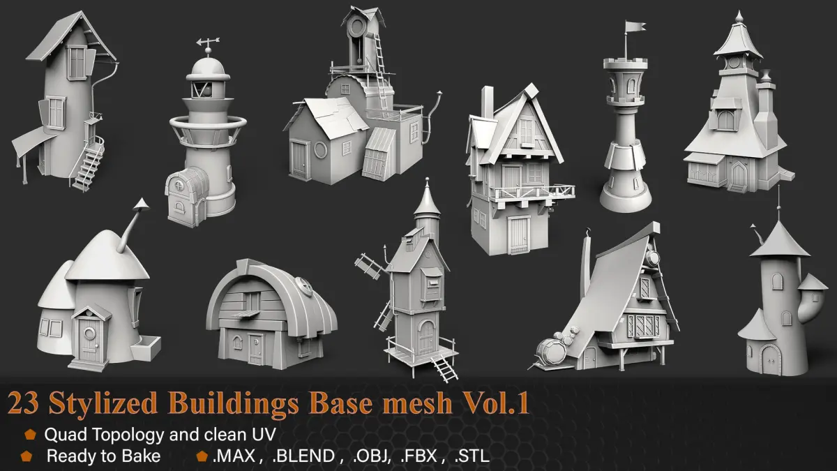 This product includes 23 stylized Building base meshes for environment use.