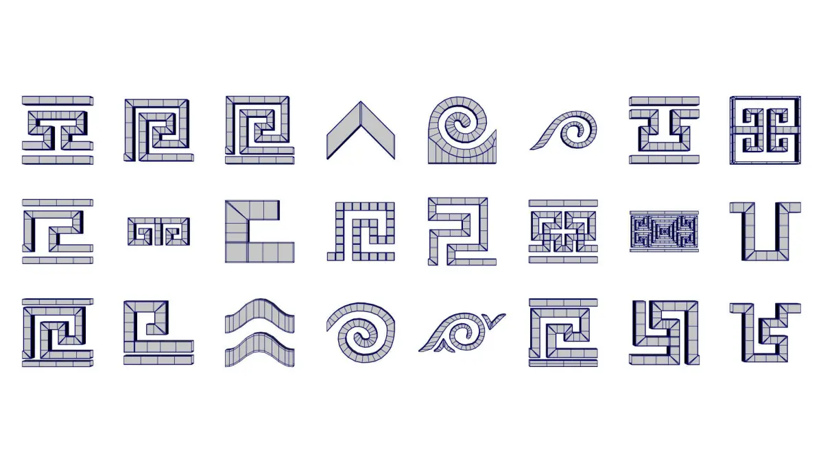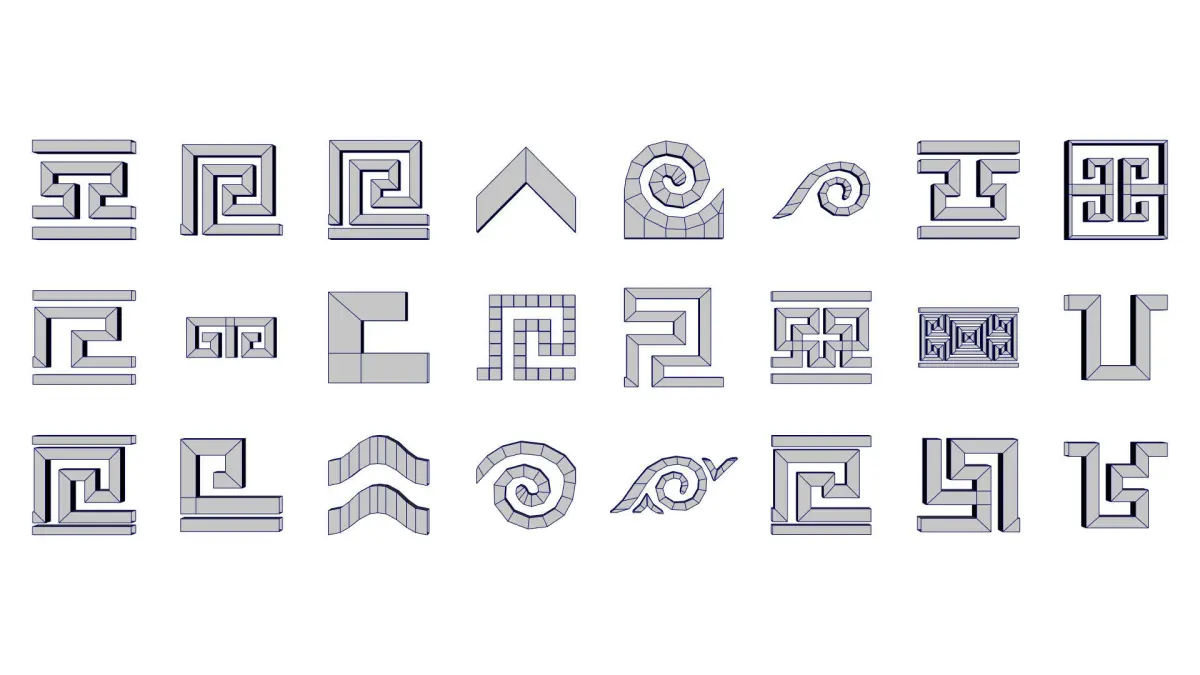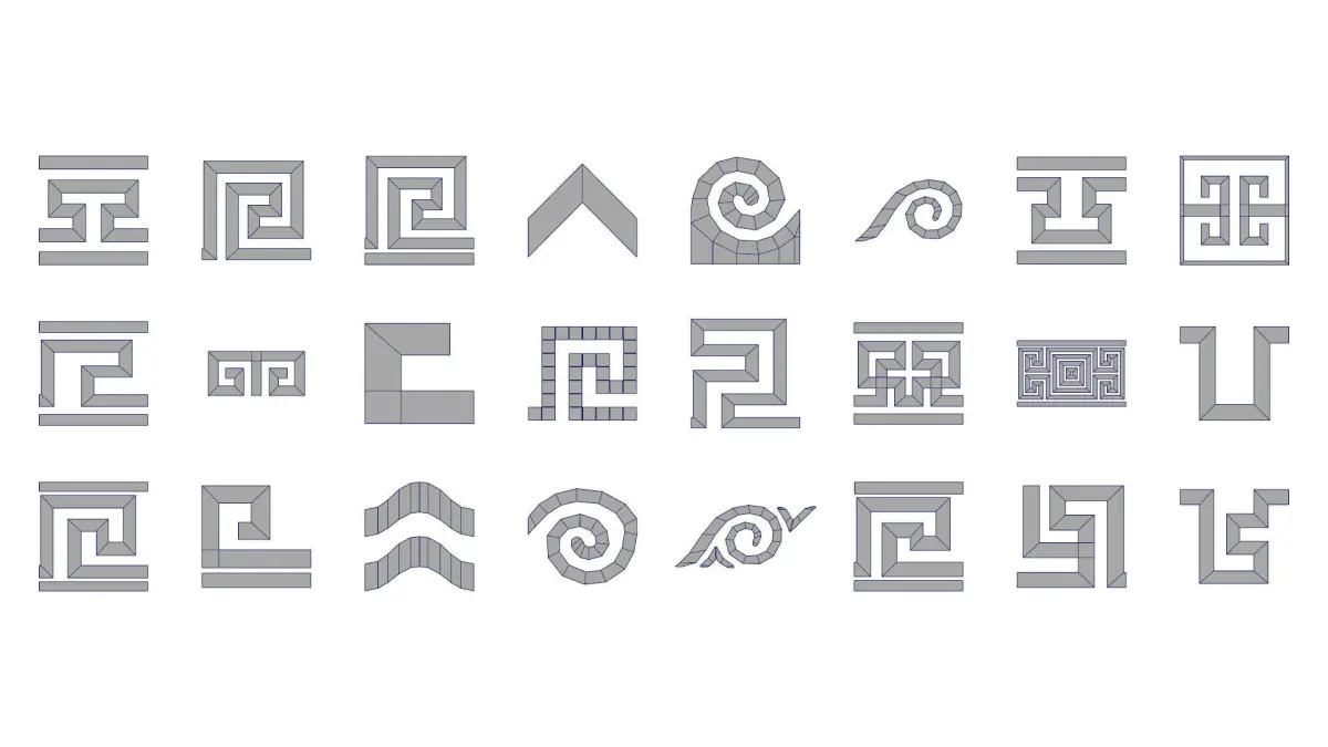greekPatterns_flat (single sided planes)greekPatterns_verylowPoly (As low poly as they can be)greekPatterns_lowPoly (low poly with enough geometry to preserve detail if mesh is deformed, mesh will not preserve sharp edges if subdivided)greekPatterns_preSubdiv (Geometry with the required divisions to preserve sharp edges after subdivision)greekPatterns_subdiv01 (Geometry on subdivision 1 with sharp edges)
