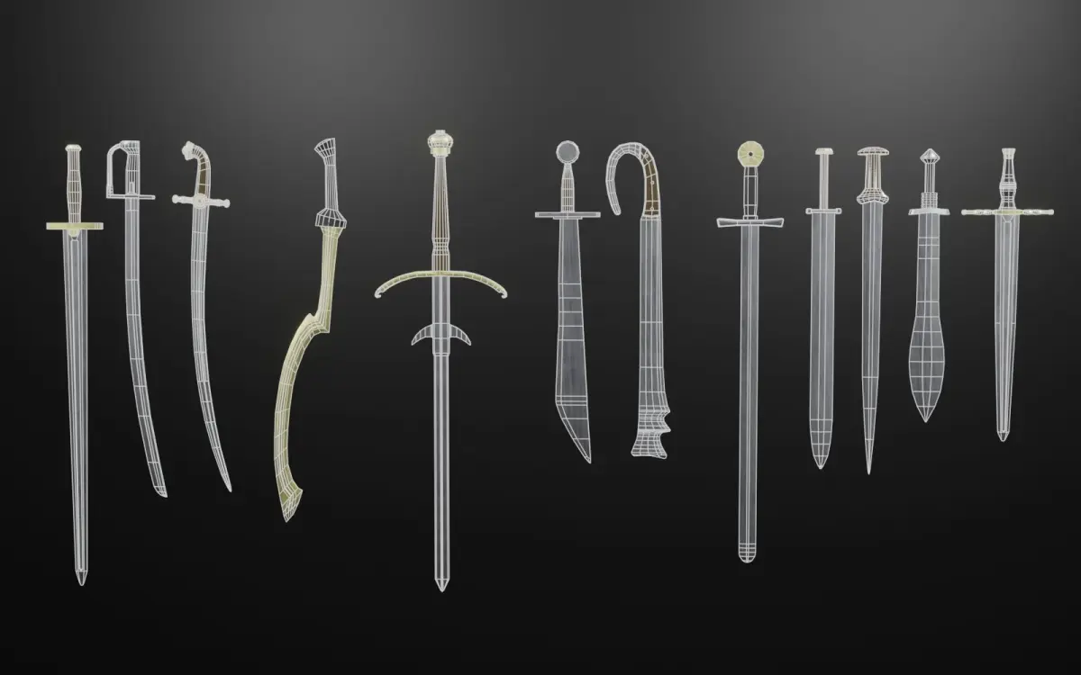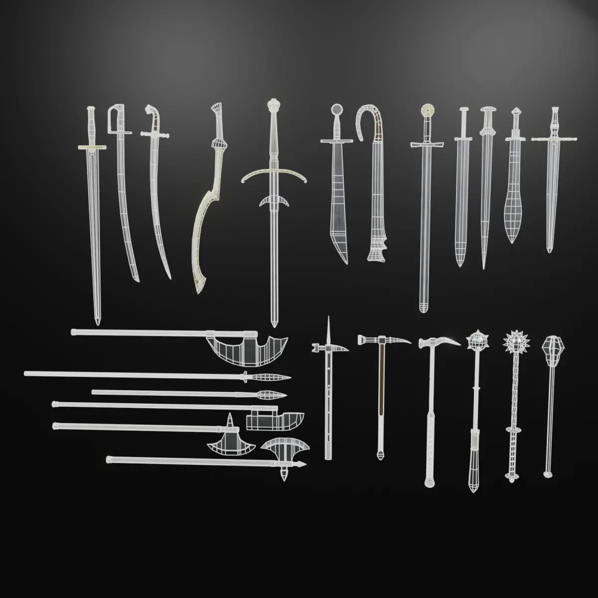 A set of medieval weapons that contains 24 types of weapons.Types of blade weapons like: long sword, short sword, gladius, griechischer Xiphos, German Spatha, Deutsches Schwert, Deutscher Zweihander, two types of falsions, saber, hapesh, saber poland.Blunt weapons: mace, morgunstern, shestoper, cavalry hammer, čаkan, Lucerne hammer.Polearms: berdysh, spear, rogatina, two kinds of halberds, glaive.