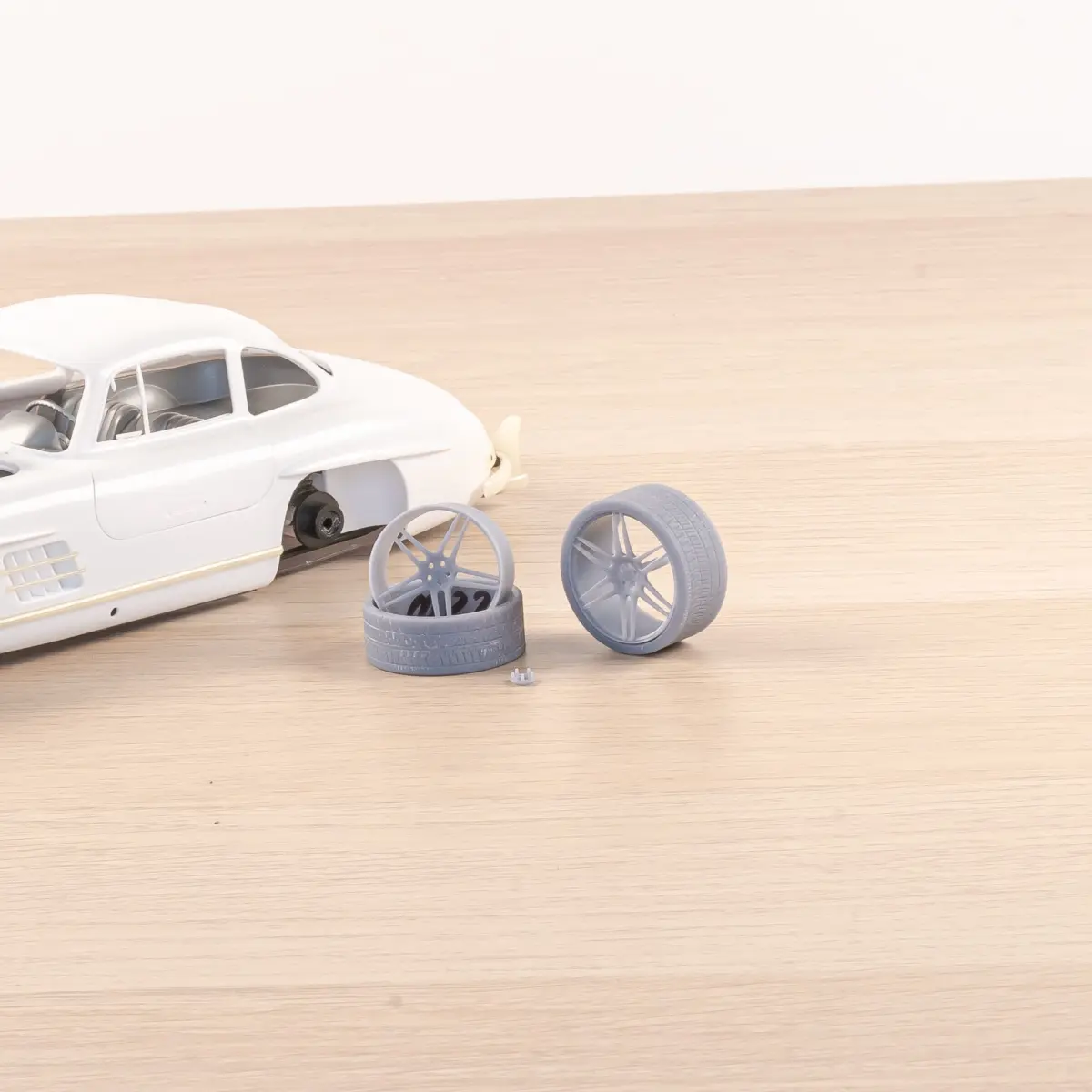 These wheels fit perfectly on Tamiya plastic model cars in 1/24, and it has been tested on several models, the VW 1300 Beetle (24136) and the Mercedes-Benz 300SL (24338).And they fit perfectly together with the set of brakes discs I have made, originally also for my 1/24 model 300SL.