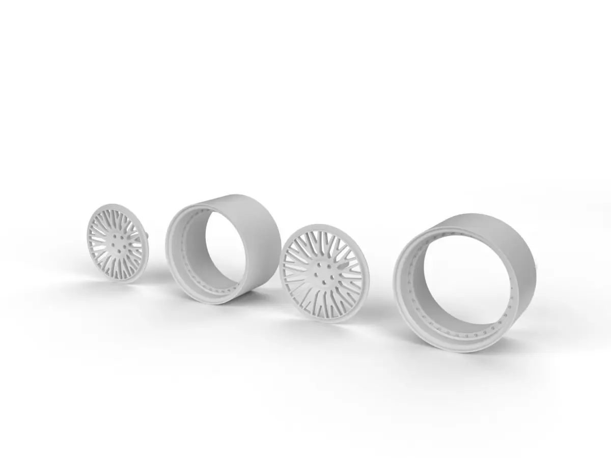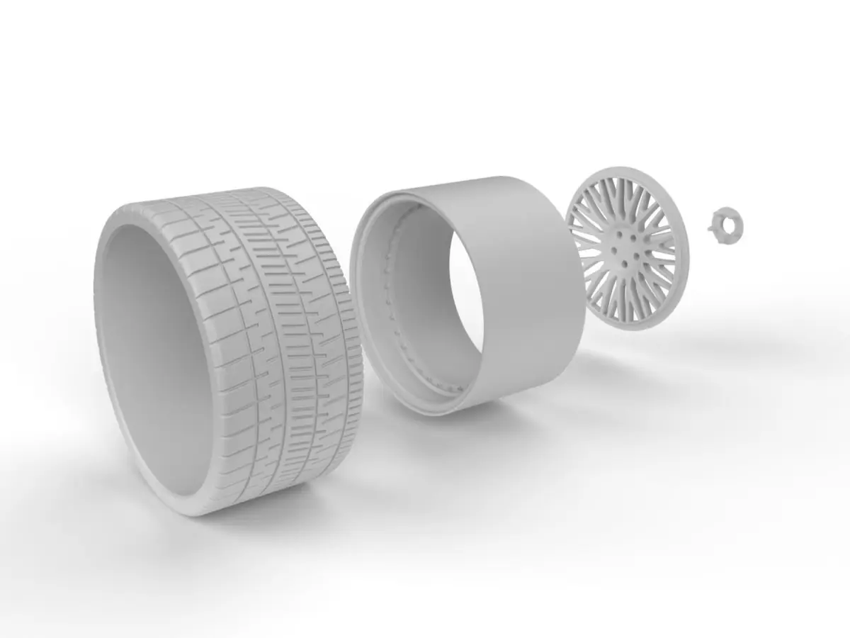 Each wheel is made up of 4 parts. Two parts for the rim it self, the tire and the bolts. These parts have been made separate, to make it easier to paint.