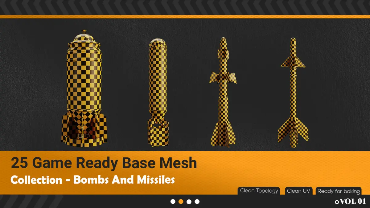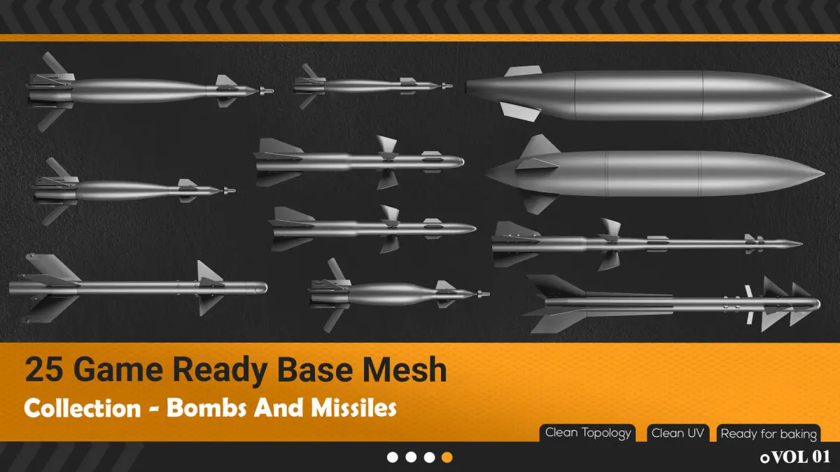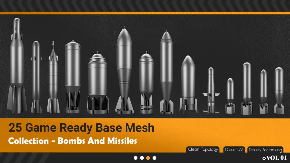Working on the initial modeling of an idea can take a lot of time. In this package, we have prepared 25 different models of bombs and missiles. By purchasing this product, you can save a lot of time in your modeling and work process. This product contains 25 types of bombs and missiles in OBJ and FBX format with All models have both UV channels 1 and 2 which you can create your high-poly model and bake it. All Model are under 10k tri and you can use them in game engines easily.