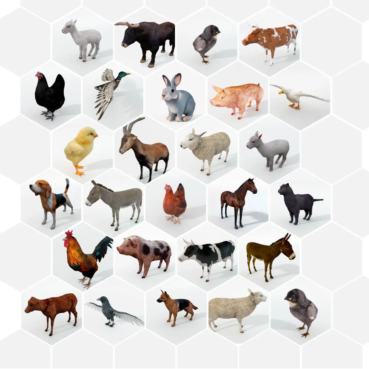 25 Farm/Domestic Animal Models Low Poly package/collection. Perfect for games, scenes or renders.All textures are UV mapped for easy editing. (2048x2048 pixels).