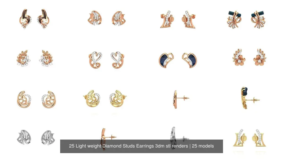 - 25 Light weight Diamond Studs Earrings 3dm stl renders