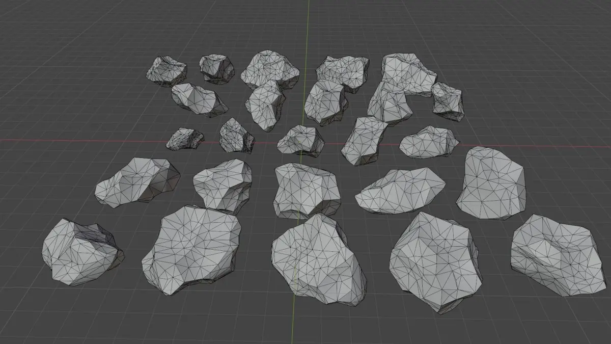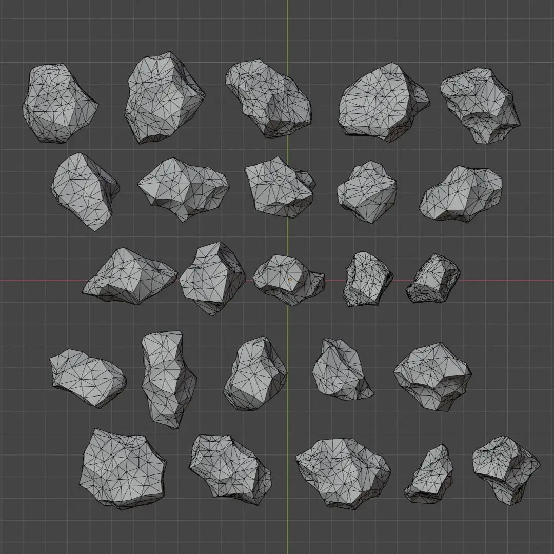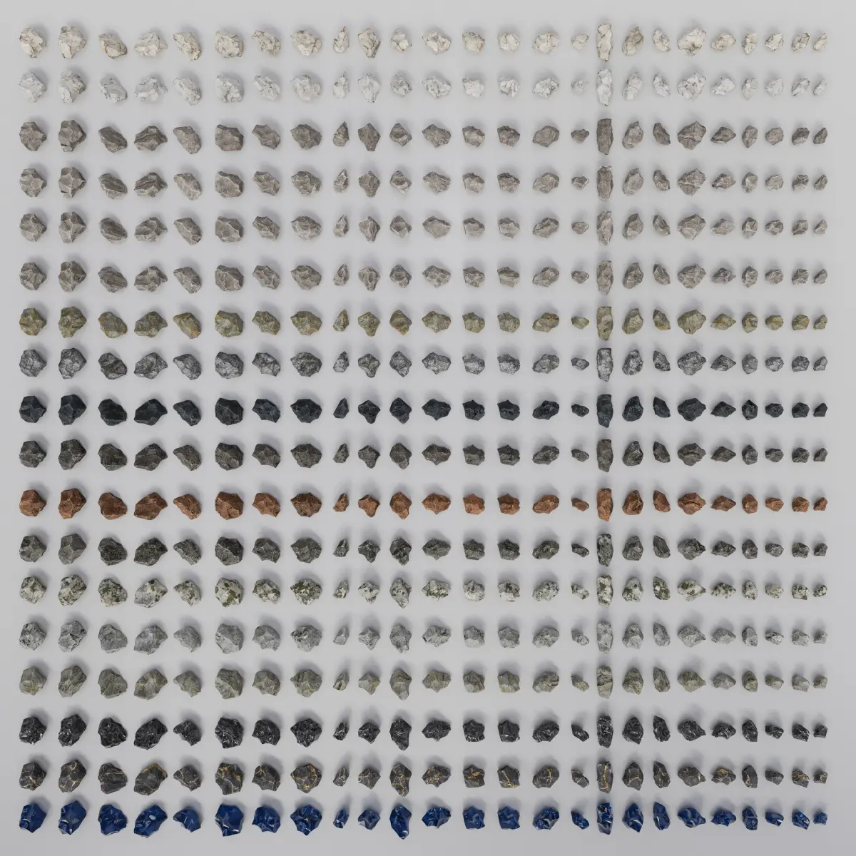 25 types of stones in 18 colors for games and rendering. All textures are in 4K resolution. A single material is used for all meshes. Maps included: BaseColor / AO / Roughness / Metalic / Normal / Transmission (for crystal).