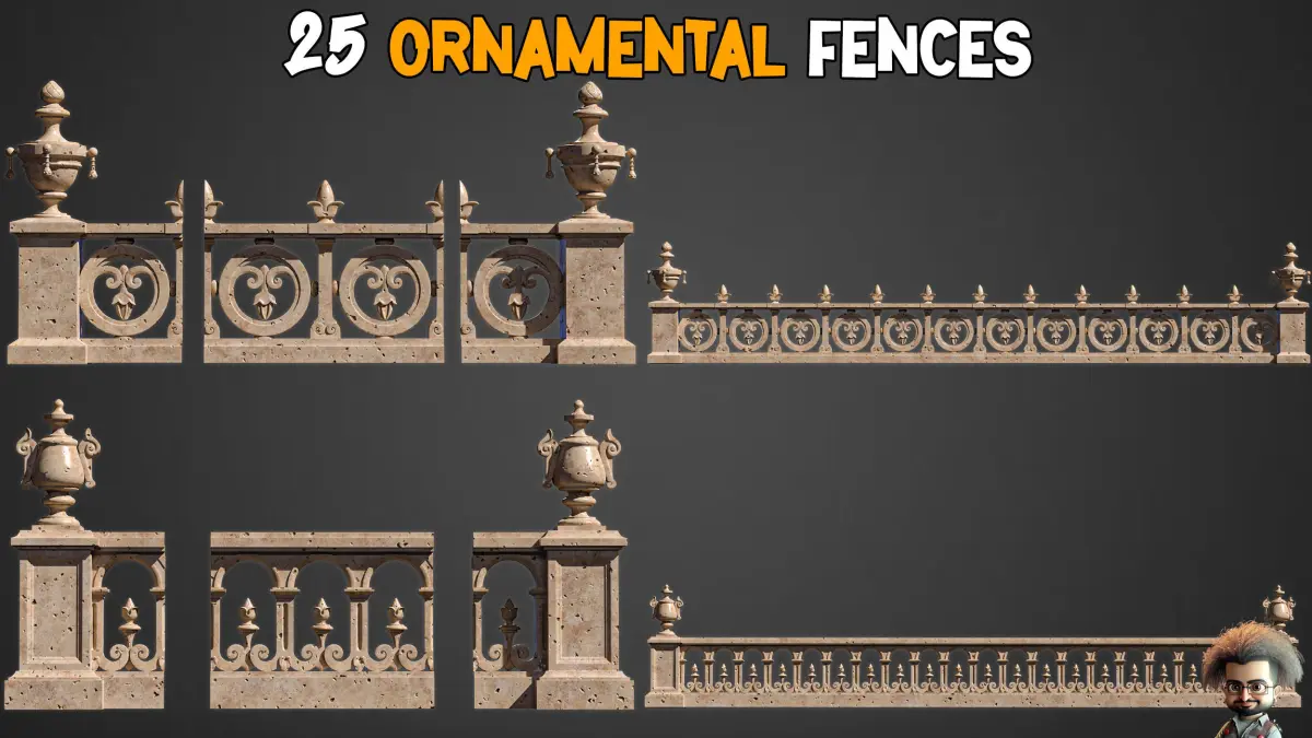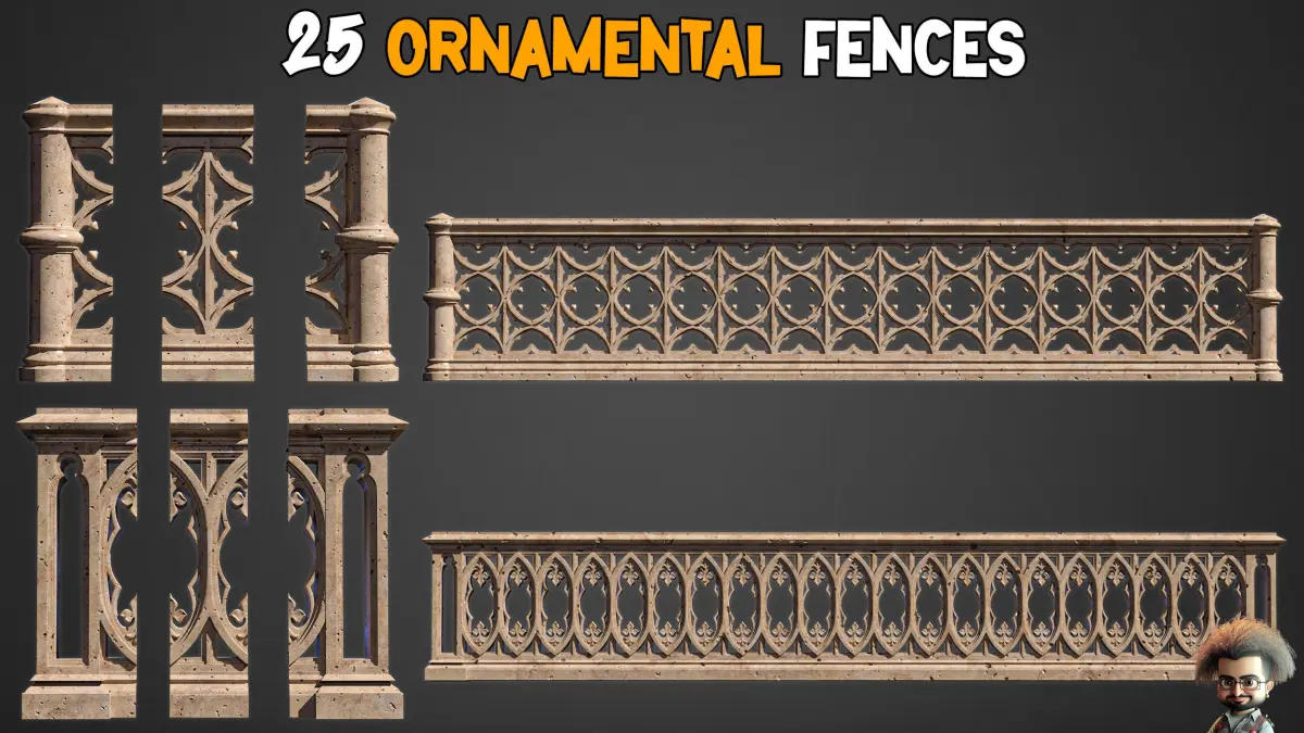25 Ornamental Fences + 3D models25 Ornamental Fences included: IMM, OBJ, FBX, MAX(2018), PDF(Previews)UnwrappedLowPoly & HighPoly