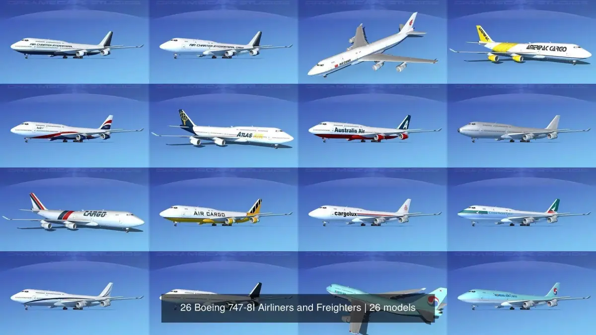 The collection of 26 Boeing 747-8I jets is built near to scale within a couple of percent of the actual dimensions of the aircraft. These models include many animateable features including flaps, ailerons, elevators, rudder, landing gear, landing gear doors and turbines. Native format is 3ds Max. Models are exported to a wide variety of formats. Exported formats (3ds, lwo and obj) are prepared well to work correctly with every standard modeling software. Compatibility level with other software’s may be limited. Models are textured with multiple large HD maps and provide a good realistic rendering when lighted and animated properly. Models are developed for animation and rendering in-flight. These may be used for other purposes such as a static model to populate an airport scene. Previews were rendered using 3dsmax standard scanline.The Boeing 747-800 is the largest of the 747 family of jumbo jets and the latest in Boeings expansion of the line. The passenger version, named 747-8 Intercontinental or 747-8I, is designed to carry up to 467 passengers in a 3-class configuration. The first 8I was delivered in May 2012 to Lufthansa.
