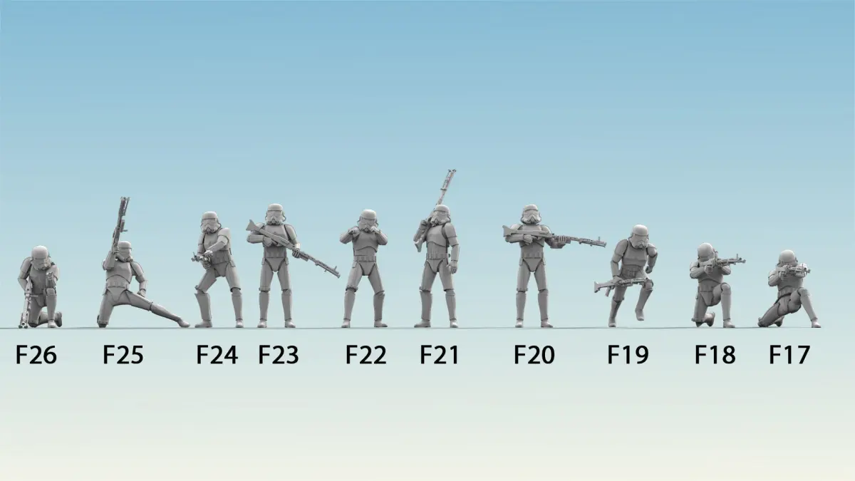 This is a HighPoly Printable model of 26 Stormtrooper Figure .26 stl file with 3 guide image are provided.Characters in STL File have 5 cm height one of them have 6.5 cm height,and in another formats have 194 cm height .