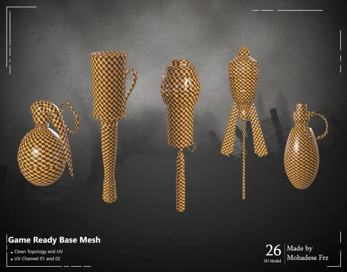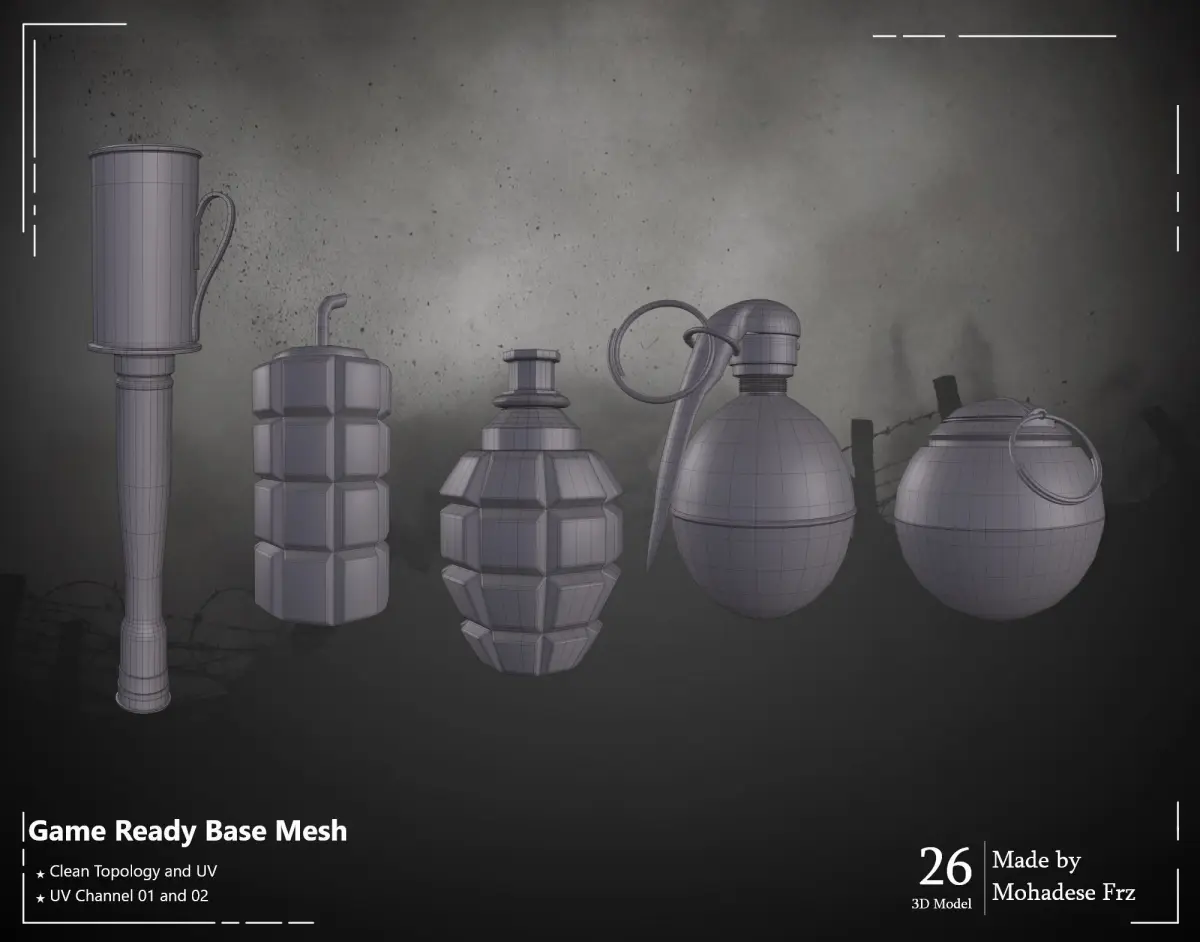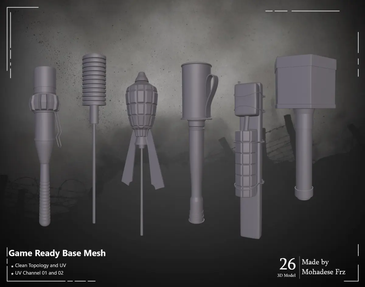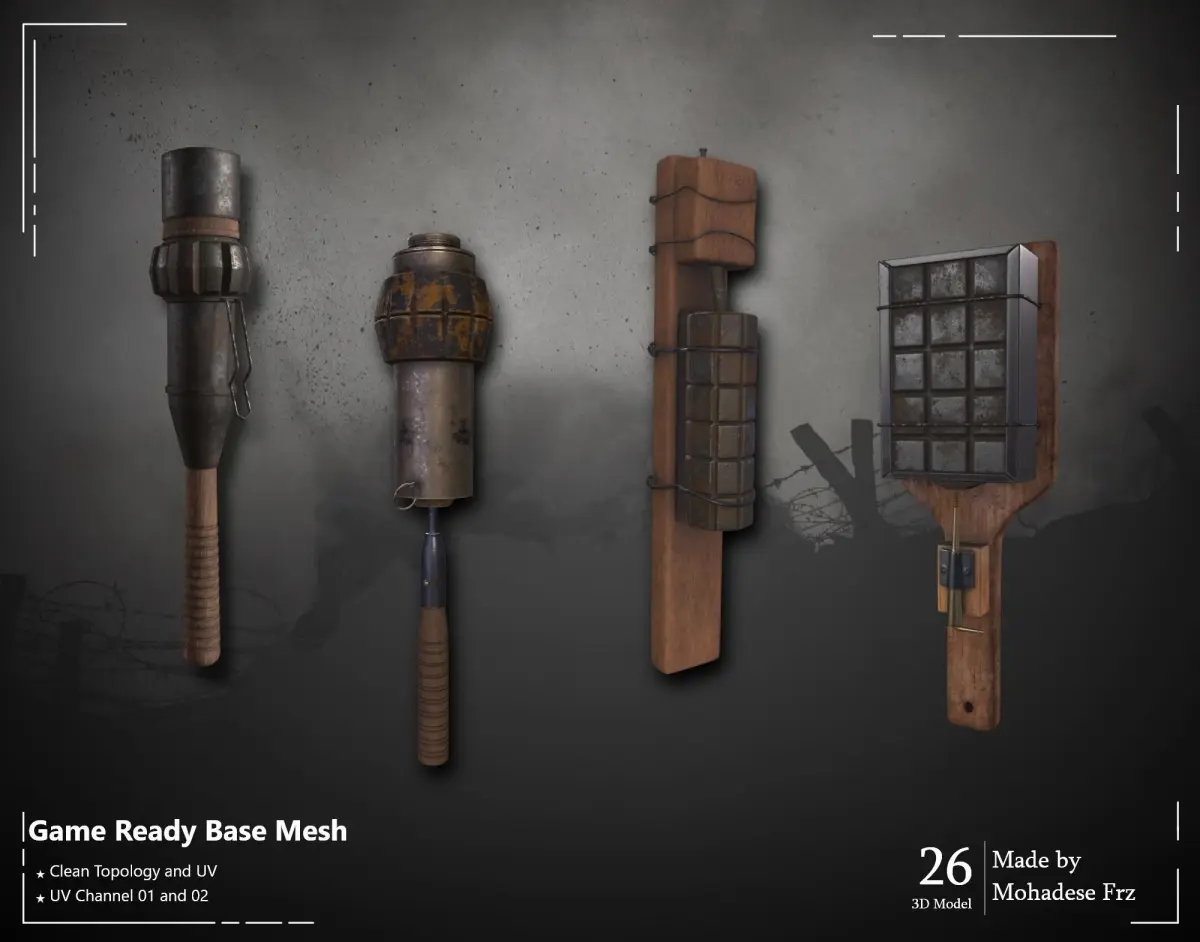 Information about this product:26 world war grenade models for use in 3D projects made in base mesh.