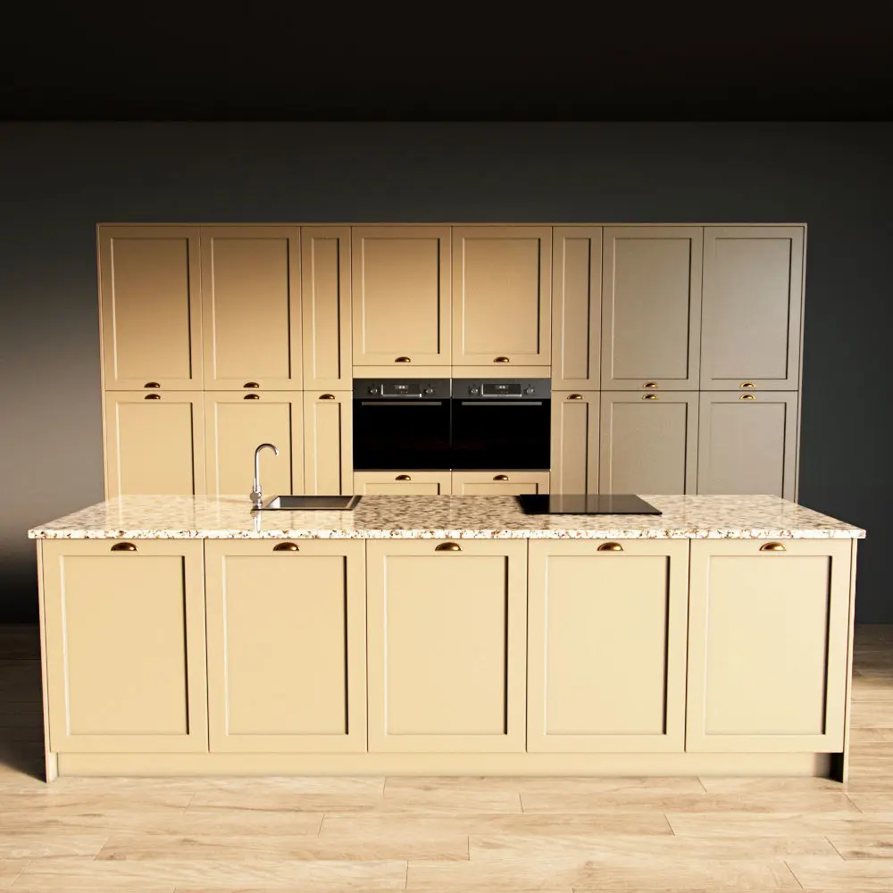 Only the kitchen and the island are present in the scene. The floor, walls, ceiling are yours.
